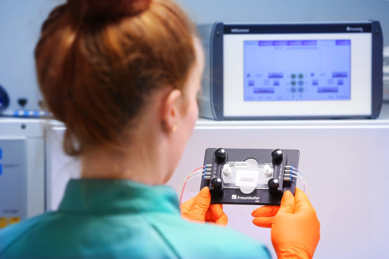 Bereits seit über zehn Jahren beschäftigen sich die Forschenden am Fraunhofer IWS mit den Mini-Laboren. Mit diesen mikrophysiologischen Systemen im Format einer Tablettenschachtel lassen sich Organfunktionen oder auch Krankheitsprozesse mit Hilfe von Zellkulturen künstlich darstellen. Ventile und Kanäle simulieren das Gefäßsystem, eine kleine Pumpe den Herzschlag. Gefertigt werden die mikrophysiologischen Systeme aus übereinander geschichteten Kunststofffolien. In diese werden mittels Laser Blutbahnen und Kammern geschnitten. In speziellen Modulen legen die Anwender später Zellkulturen an, die bis zu einem Monat in den Mikrosystemen überleben können. In dem Miniatur-Labor zirkuliert derweil das Blut in Form von Nährmedium, das die Zellen mit Sauerstoff und Nährstoffen versorgt. Vor ein paar Jahren noch war in diesem Rahmen lediglich die Darstellung zweier Organe möglich. Heute sind es bereits vier, die sich gleichzeitig auf diesen neuartigen Multiorgan-Chips simulieren lassen.