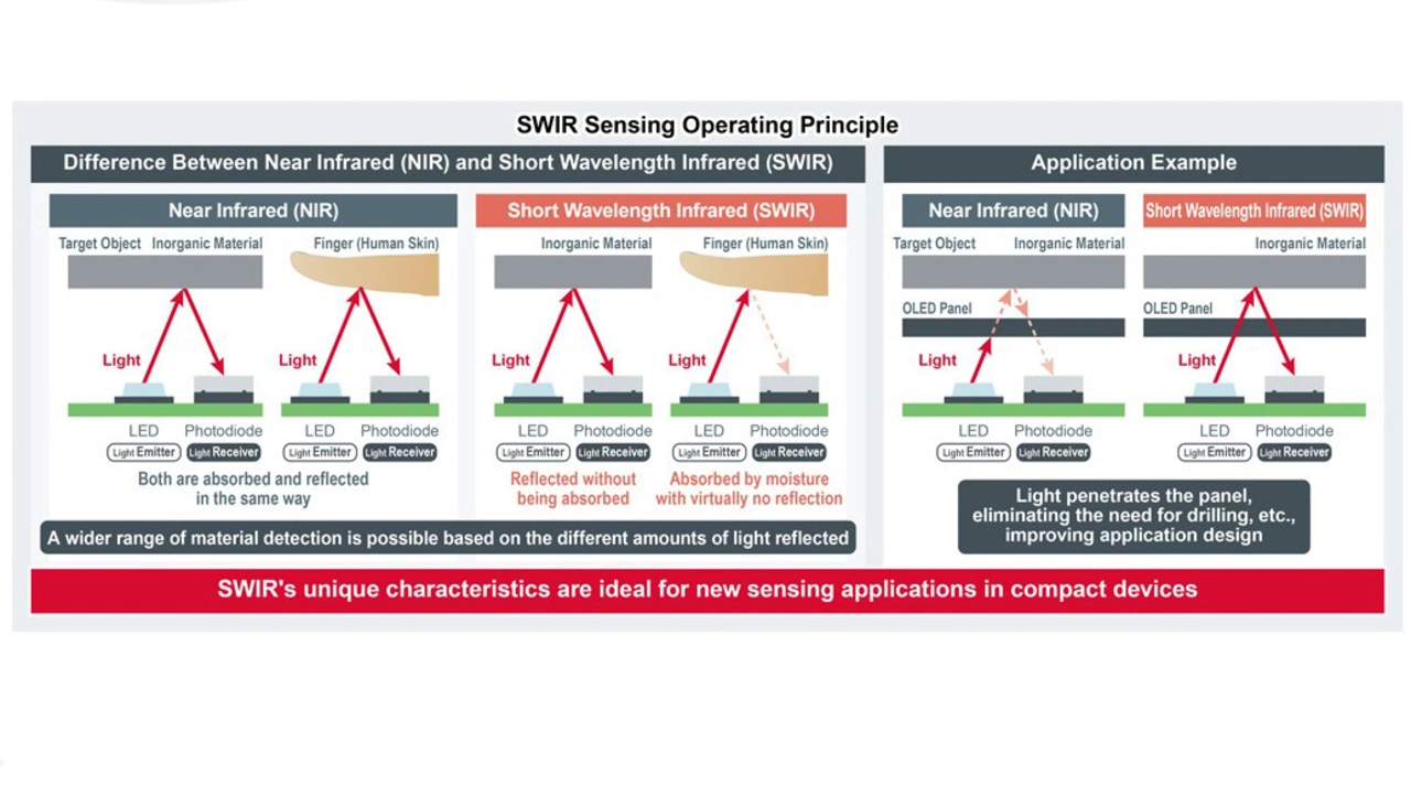 SWIR wird zum Nachweis von Substanzen und deren Bestandteilen verwendet. Dazu werden die Eigenschaften von Wasser, Eis, Gasen etc. genutzt, die bestimmte Wellenlängen absorbieren. Zu den Hauptanwendungen gehören Lichtquellen für Geräte zur Bestimmung der Sauerstoffsättigung im Blut und des Blutzuckerspiegels im medizinischen Bereich sowie zur Ermittlung des Wasser- und Zuckergehalts von Obst und Gemüse in der Lebensmittelindustrie. Darüber hinaus wird damit gerechnet, dass OLED-Panels für Sensoranwendungen in tragbaren Geräten und Wearables zur Gesundheitsüberwachung und für andere neuartige Funktionen eingesetzt werden.