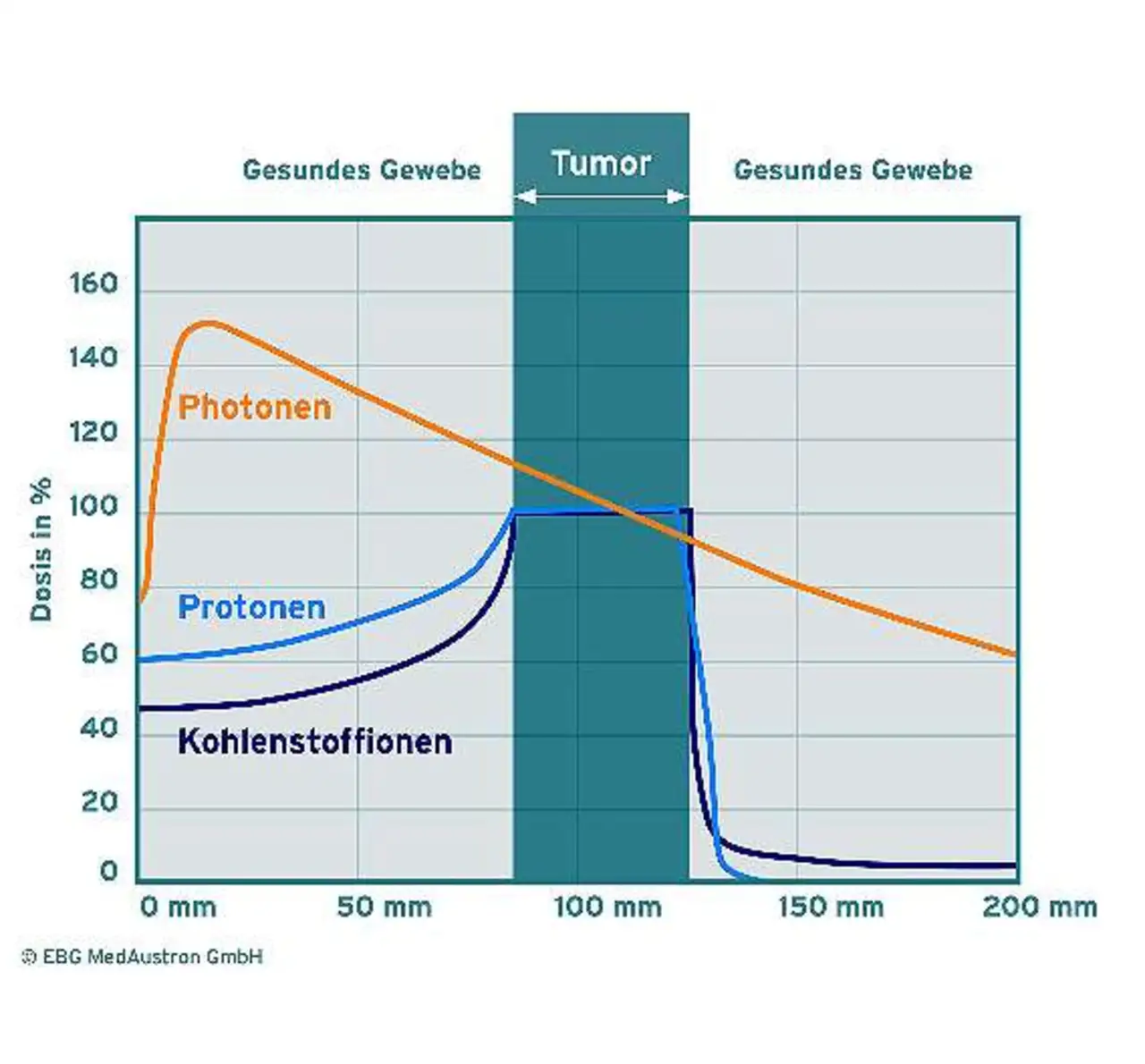 Durch die dreidimensional präzise Protonendeposition ist die dadurch erreichbare Strahlendosis im Ziel höher als beim Einsatz der konventionellen Röntgenstrahlung und der mittels Linearbeschleuniger erzeugten Photonen (Bild 1).