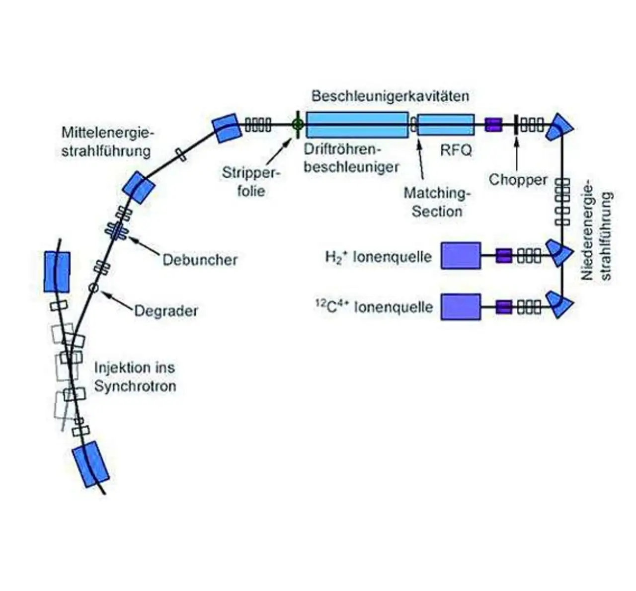 Drei Ionenquellen erzeugen die für die Bestrahlung notwendigen Teilchen, also Protonen oder Kohlenstoffionen (Bild 2). Der sogenannte »Linac-Bunker« (Linear Accelerator, also Linearbeschleuniger) beschleunigt diese geladenen Teilchen auf gerader Strecke durch elektrische Wechselfelder auf 36 000 km/s (circa 12% der Lichtgeschwindigkeit), woraufhin sie ins Synchrotron eintreten. Dieser Kreisbeschleuniger mit einem Umfang von 80 m bringt sie dann auf ihre Endgeschwindigkeit, etwa 200 000 km/s (rund zwei Drittel der Lichtgeschwindigkeit). Das Synchrotron wurde auf Basis des im Hadronentherapiezentrum CNAO in Pavia nahe Mailand erprobten Designs in enger Kooperation mit dem CERN entwickelt.
