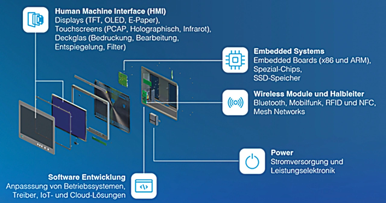 Das hochauflösende Display wird immer genau abgestimmt auf die jeweilige Anwendung, etwa als OP-Display, und die spezifischen Anforderungen an hohen Kontrast, Helligkeit sowie einen weiten Blickwinkel für hohen Sehkomfort. Die Komponente ist variabel mit und ohne Optical Bonding erhältlich. Ein individuell steuerbares LED-Modul mit einer homogen ausgeleuchteten Fläche ist von der Größe bis zur Farbe individuell anpassbar.
