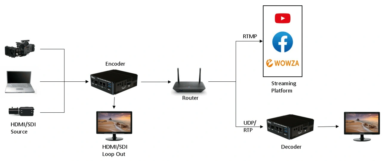 Der Codierungsprozess des ULL-Streamers beginnt mit der Erfassung hochwertiger Videos von 12G-SDI- oder HDMI-2.0-Quellen mit einer Auflösung von bis zu 4K und 60 Bildern pro Sekunde (fps). Während eines chirurgischen Eingriffs wird die Videoübertragung in kleinere, effiziente Datenpakete kodiert und über Wi-Fi 5 gestreamt. Unterstützte Protokolle wie UDP, SRP, RTMP und RTSP erleichtern die Kompatibilität mit einer Reihe von Streaming-Plattformen. Die kodierten Daten werden von einem Decoder empfangen und auf Highspeed-Monitoren und -Geräten wie dem Apple Vision Pro angezeigt. Um die Flexibilität zu erhöhen, kann das Video auch auf webbasierte Plattformen wie YouTube und Wowza gestreamt und an die spezifischen Bedürfnisse der medizinischen Endanwender angepasst werden. Um die Datensicherheit zu gewährleisten, bietet der ULL-Streamer eine Ver- und Entschlüsselung für Video- und Audiodaten, die von 12G-SDI- oder HDMI-2.0-Quellen erfasst werden, sodass die Vertraulichkeit der Patientendaten beim Streaming gewahrt bleibt.
