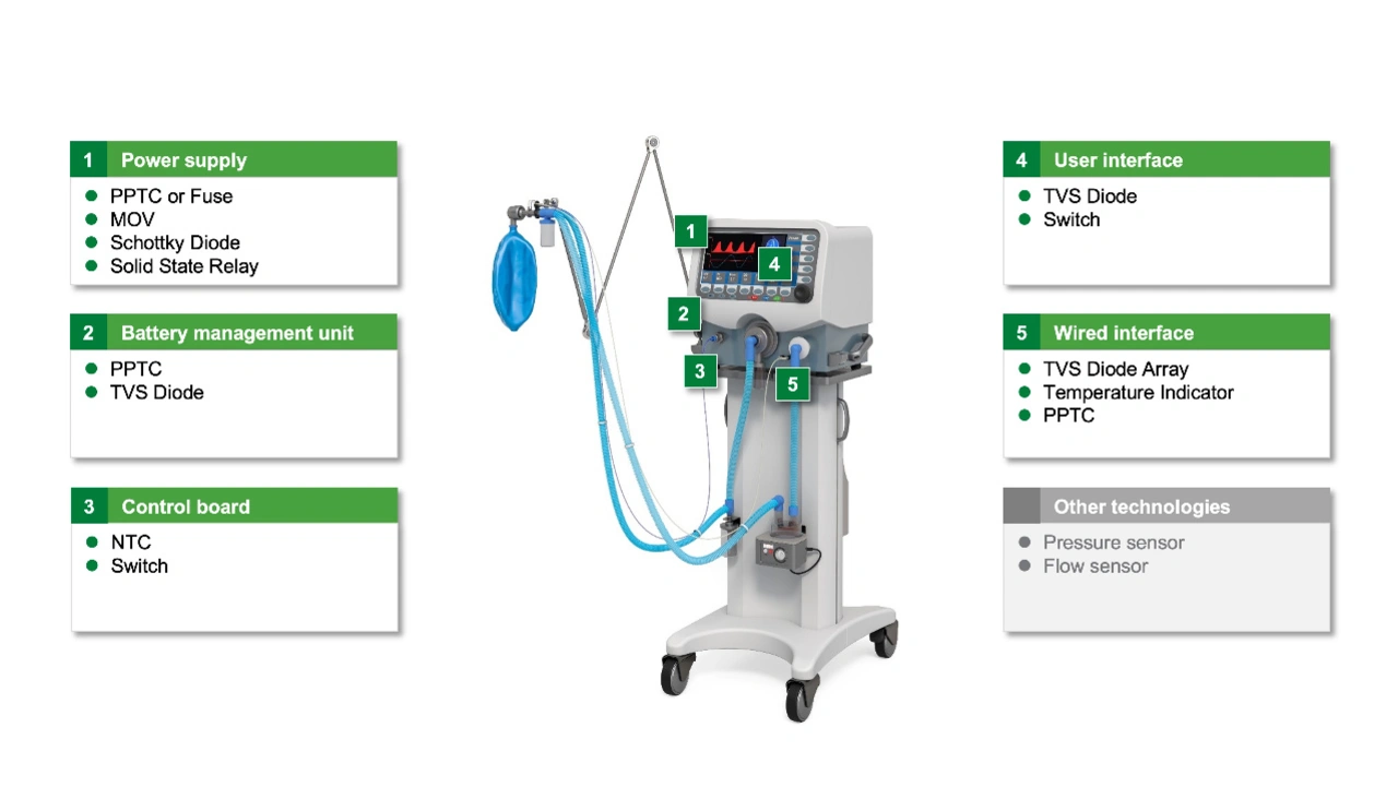 Dieser Artikel stellt wichtige Überlegungen zu den verschiedenen geeigneten Komponenten für den Überlastschutz, die sichere und effiziente Steuerung sowie schützende Sensoren von medizinischem Gerät für die Intensivpflege dar. Anhand von drei medizinischen Geräten – einem Beatmungsgerät, einem Defibrillator und einem tragbaren Ultraschallgerät – veranschaulicht er, wo Schutz-, Steuerungs- und Sensorkomponenten erforderlich sind.