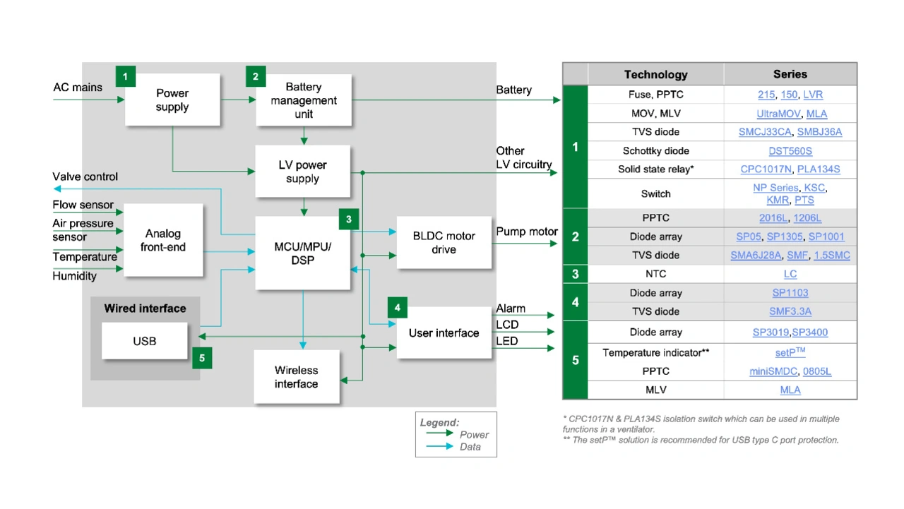 Abbildung 1 zeigt ein Beispiel für ein Beatmungsgerät für die Intensivpflege, das für den Einsatz im Krankenhaus konzipiert ist. Außerdem sind Schutz-, Steuerungs- und Sensorkomponenten aufgeführt, die für die verschiedenen Funktionsblöcke in Betracht kommen. Abbildung 2 zeigt ein Blockdiagramm eines Beatmungsgeräts, und die nebenstehende Tabelle enthält die möglichen Komponenten für bestimmte Schaltkreisblöcke.