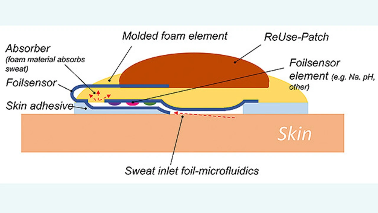 Für die kontinuierliche Messung von frischem Schweiß muss sichergestellt werden, dass sich keine Elektrolyte in der Flüssigkeit ansammeln. Die am Smart Patch eingesetzten Covestro-Materialien können dafür neben ihrer Funktion als Trägermaterial für den Sensor auch als Absorber dienen. Durch die von Accensors entwickelte und eingebaute folienbasierte Mikrofluidik kann eine Kapilarwirkung erzeugt werden, die den langsamen Durchfluss von Schweiß ermöglicht. Die betrachtete Flüssigkeit wird anschließend in einem Absorberschaum gesammelt und beim Austausch des Disposable Patches entsorgt (Bild 2).