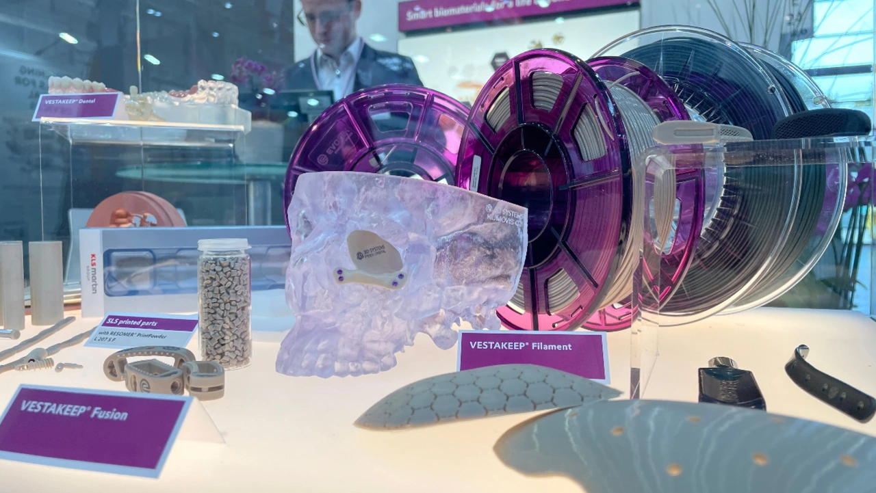 Evonik zeigt auf der Compamed sein Portfolio an Rohmaterialien und Kunststoffen für die Medizintechnik, speziell biokompatibel konzipiert für den direkten Kontakt mit dem menschlichen Körper. Die Pulver, Stäbe und Filamente dienen als Grundstoffe für den Spritzguss und den 3D-Druck. Die noch recht junge Additive Fertigung stand auch 2023 im Fokus des Evonik-Standes in Halle 8b, den der deutsche Chemieriese als Zukunftsfeld und Wachstumsmarkt unterstützt, insbesondere mit Kunststoffen sowie PEEK-Materialien als Metallersatz für Implantate. Neu für den 3D-Druck ist ein kohlefaserverstärktes Filament von der Rolle, welches für den Langzeiteinsatz als Knochenplatte oder Wirbelsäulenersatz im Körper konzipiert wurde. Im Gegensatz zum PEEK-Material, was weicher als Metall ist und eine natürliche Elastizität aufweist, hat das Carbon-verstärkte Filament eine höhere Steifigkeit und ermöglicht als Knochenersatz neue medizinische Anwendungen. Ziel ist der langfriste Druck von Implantaten vor Ort im Krankenhaus. Evonik ist sehr stolz darauf, dass nach fünf Jahren Filamenten für die additive medizinische Fertigung bereits zwei Kliniken in Salzburg und Basel ein eigenes Qualitätsmanagement mit MDR-Compliance für den filament-basierten 3D-Druck aufgebaut haben – die beiden Häuser werden damit zu Medizinprodukteherstellern. Das kohlefaserverstärkte Material befindet sich bereits in der Zertifizierung und steht Kunden für erste Tests und Untersuchungen zur Verfügung, ab 2024 sollen damit erste Medizinprodukte herstellbar sein.