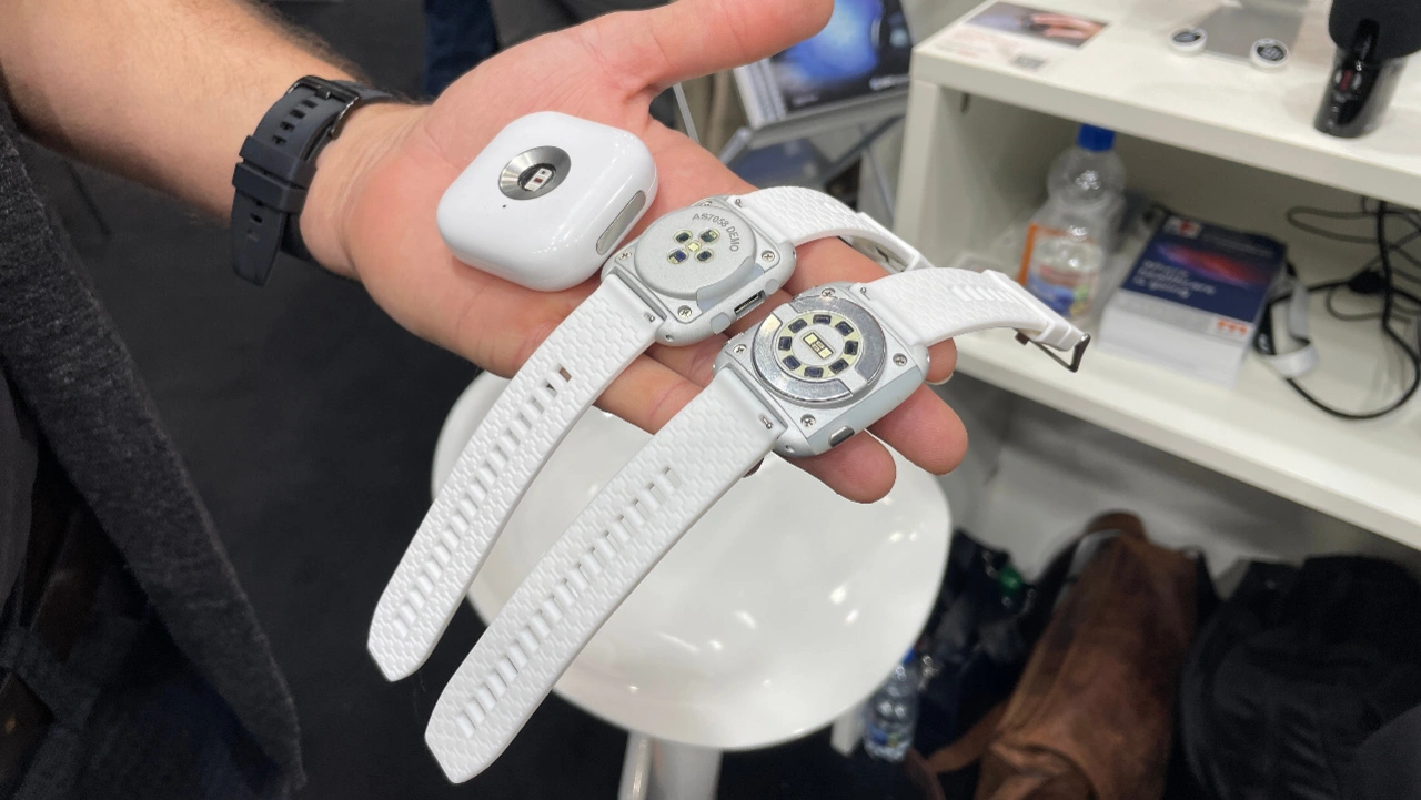 Der Fokus des österreichisch-deutschen Sensor-Herstellers ams Osram lag am Stand D33 in der Medica-Halle 12 auf optischen Sensoren und Bauteilen für die Vitaldatenmessung an smarten Uhren, Ringen und anderen tragbaren Geräten. So unterscheidet sich das neue analoge Frontend AS7058 von anderen Vitaldatensensoren dadurch, dass es auch Körperimpedanzmessungen zur Analyse von Fett, Wasser, Knochen und Muskeln im menschlichen Körper durchführt. Der modular und kundenindividuell aufbaubare Baustein hat einen sehr niedrigen Stromverbrauch bei gleichzeitig hoher Signalintegrität und dient als Schaltzentrale des gesamten Sensors. »Der Sensor misst das optische Signal mit verschiedenen Wellenlängen, daraus können prinzipiell alle Vitaldaten abgeleitet werden,« sagt Produktmanager Florian Lex. Zu den Standards gehören Herzfrequenz und deren Variabilität, aus den Rückschlüsse auf die Schlafqualität möglich sind.