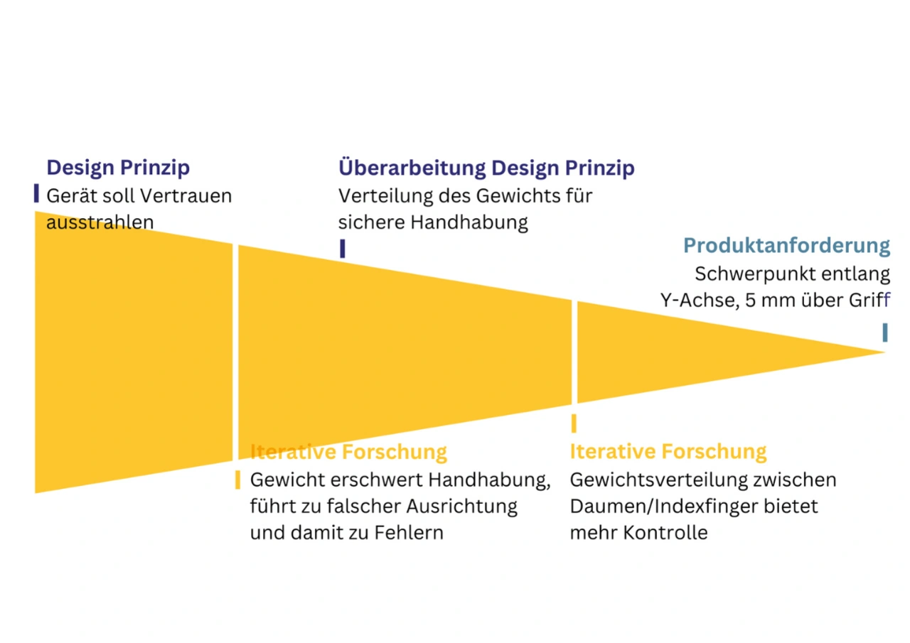 Im medizinischen Umfeld ist »Vertrauen« als Kriterium der Produktsicherheit zu verstehen. Ärzte, Assistenten und Krankenpfleger müssen sich absolut sicher sein, dass die Geräte funktionieren, die Dosierung eines Medikaments richtig eingestellt ist und die Anzeige auf dem Bildschirm den Ist-Zustand eines Patienten angibt. Bei einem Handheld-Gerät eines Medizingeräteherstellers fehlte dieses Vertrauen: Eine Evaluation vorangegangener Prototypen zeigte, dass das Gewicht des Geräts das Greifen und Halten erschwerte (Bild 2). Darunter litt die Genauigkeit des Systems und es kam zu Fehlmeldungen. Gemeinsam erarbeitete das UCD-Team mit den Entwicklern in der nächsten Iteration eine bessere Gewichtsverteilung und konnte so Vertrauen sichern.