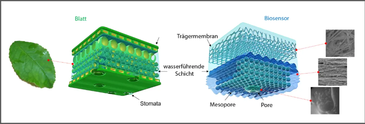 Inspiriert von der Struktur von Blättern, haben die WissenschaftlerInnen Biosensoren entwickelt, analysiert und getestet, die aus zwei Schichten, der Blattstruktur nachempfundenen Zellulosefasern bestehen, die mit Salzwasser getränkt werden können. Über dem Zellulosematerial liegt eine Trägermembran, die wiederum an eine metallische Elektrode mit Kabel andockt.