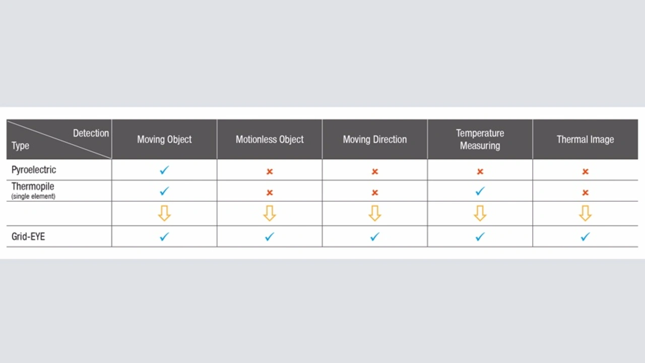 Im Vergleich zu Thermopile-Sensoren mit nur einem Element und zu pyroelektrischen Sensoren ist Grid-Eye in der Lage, Bewegungsrichtung von Personen und Objekten zu identifizieren (siehe Tabelle). Darüber hinaus detektiert der Sensor die Position und Präsenz sowie die tatsächliche Oberflächentemperatur von –20 °C bis +100 °C. Wegen dieses großen Messbereichs erreicht der Hersteller eine rauschäquivalente Temperaturdifferenz (Noise Equivalent Temperature Difference, NETD) von ±0,08 K bei 1 Hz und Raumtemperatur. Das Array der Messelemente kann auch mehrere Personen oder Objekte detektieren, die sich in verschiedene Richtungen bewegen. Aus der Nähe könnte Grid-Eye sogar Handbewegungen für die einfache Gestensteuerung erkennen.