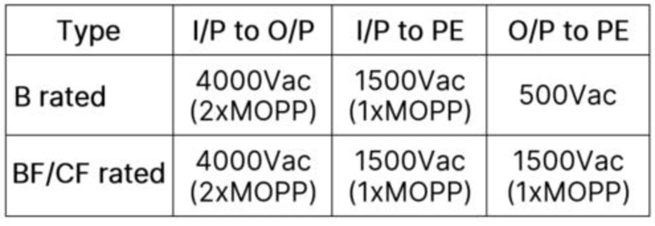 Dank 2×MOPP-Isolation eignet sich das Modell besonders für Anwendungen der Kategorie BF (Body Floating), also Geräte mit direktem Patientenkontakt, jedoch ohne Herznähe.
