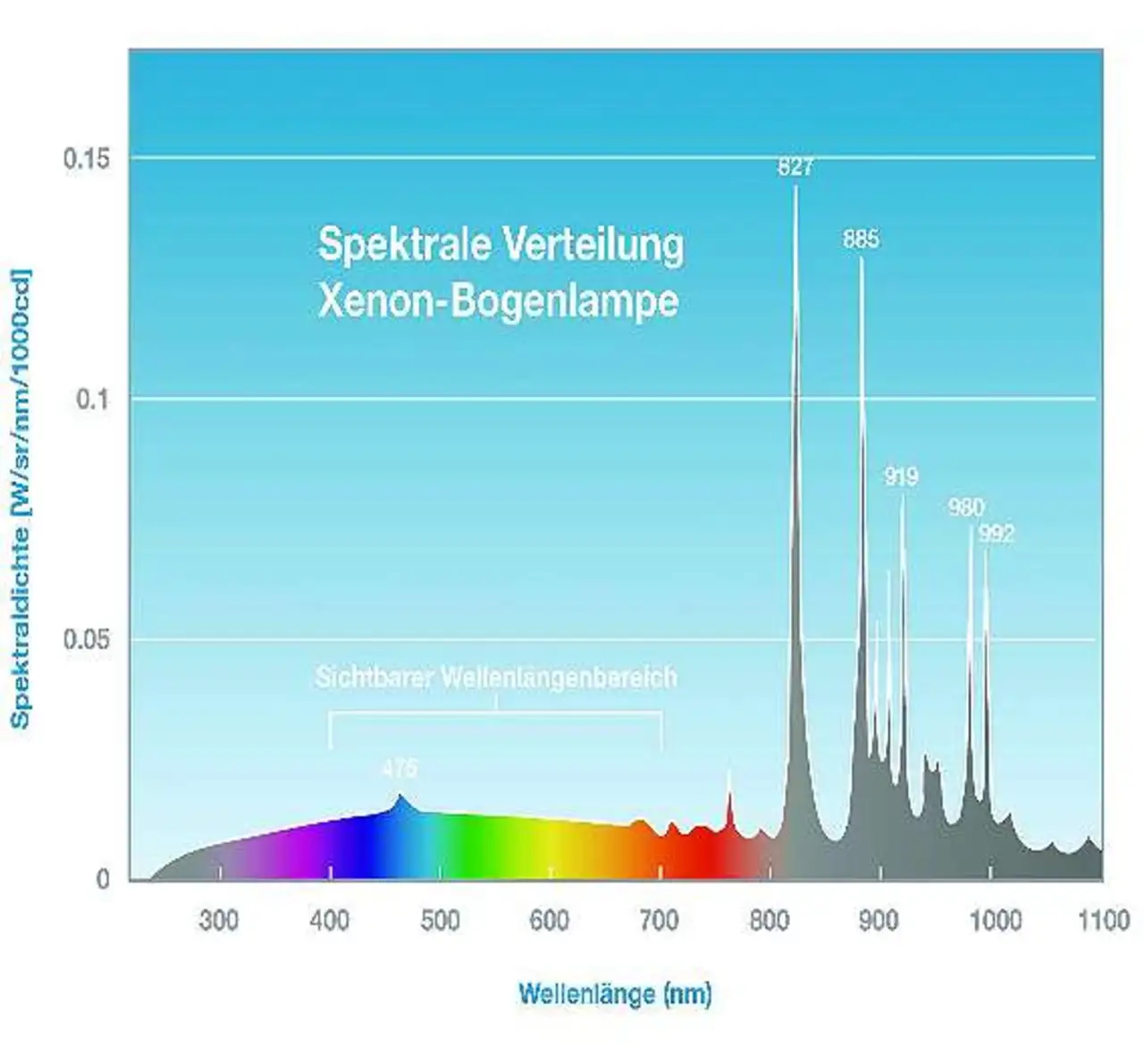 Ähnliches gilt für Xenon-Lampen, die mit 20 lm/W bis 30 lm/W deutlich weniger effizient sind. Beide weisen eine Farbtemperatur von typischerweise 6000 K auf. Halogenlampen strahlen das von der heißen Wolfram-Wendel emittierte Licht ab. Wolfram kann eine der höchsten Festkörpertemperaturen erreichen, bevor es schmilzt (Schmelztemperatur = +3422 °C). Die Farbtemperatur dieses Lampentyps liegt charakteristischerweise bei etwa 3200 K.