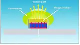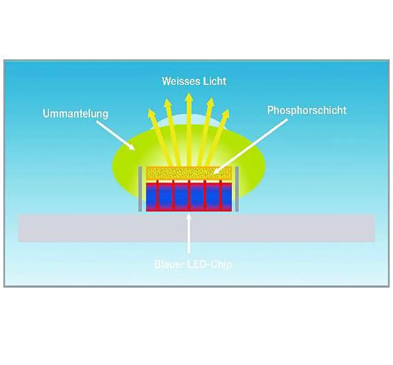 Besonders effizient sind weiße LEDs, bei denen ein eigentlich blau emittierender Chip mit Phosphoren beschichtet ist (Bild 2). Sie erreichen eine Effizienz um 100 lm/W bei einem CRI zwischen 70 und 95 und einer Farbtemperatur von circa 5500 K.