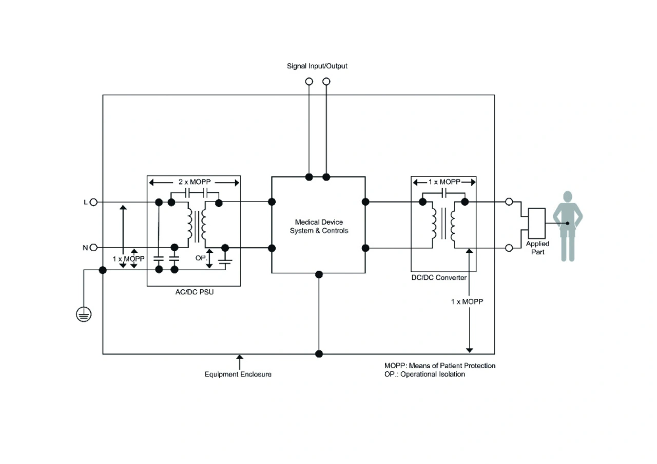 Bei Anwendungen mit höherer Leistung, wie bei chirurgischen Geräten oder motorgetriebenen Vorrichtungen, ist es unerwünscht, eine zusätzliche Isolationsstufe einzusetzen. Das liegt an der schlechten Verfügbarkeit von entsprechend isolierten DC/DC-Wandlern mit hoher Leistung und der Ineffizienz der zweifachen Umsetzung der Leistung. Bei diesen Anwendungen ist eine Stromversorgung mit den notwendigen Isolationen und Abständen sowie auch geringem Patientenableitstrom erforderlich.