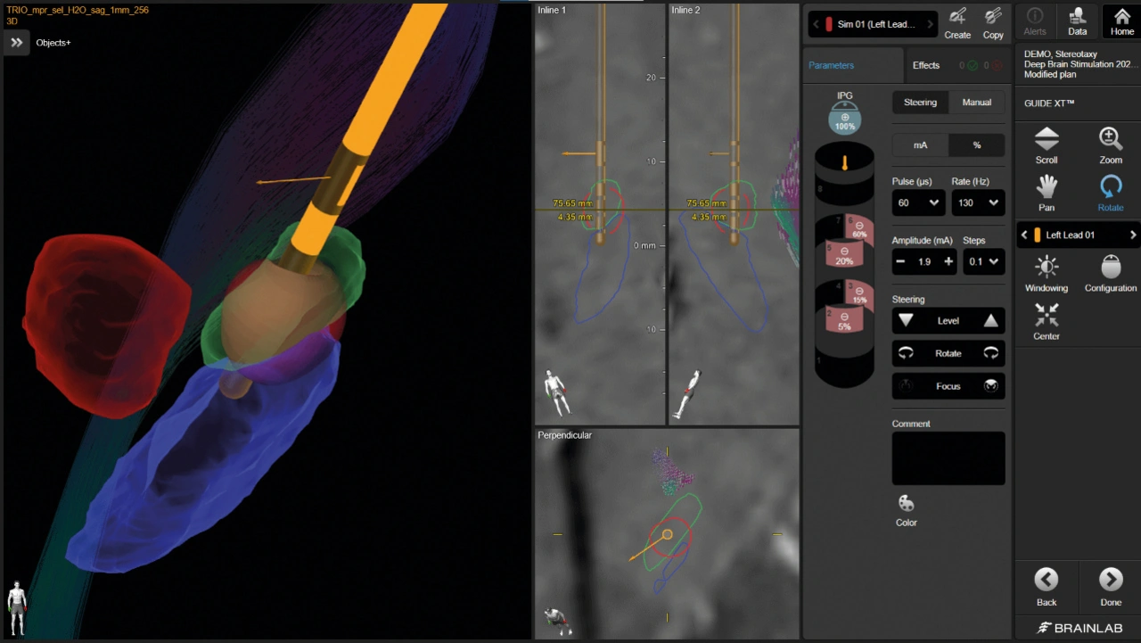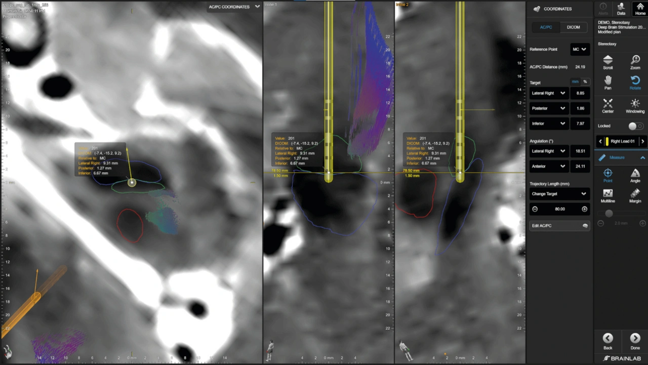 Spezialisierte Programme ermöglichen die Darstellung der implantierten Elektroden und der damit verbundenen Stimulationsfelder (Volume of Tissue Activated – VTA) in Bezug auf die individuelle Anatomie des Patienten. Dadurch wird sichtbar, welche Areale durch bestimmte Stimulationsparameter beeinflusst werden. Dies kann die Programmierungszeit erheblich verkürzen, da der programmierende Arzt Simulationsparameter sowohl vor der Patientenvisite als auch direkt während des Besuchs planen und so die Stimulationsabdeckung des therapeutischen Zielbereichs maximieren kann. Zudem trägt die präzise Modellierung des Wirkungsbereichs dazu bei, die Wirksamkeit der DBS-Therapie zu maximieren und gleichzeitig kognitive oder motorische Nebenwirkungen zu minimieren.
