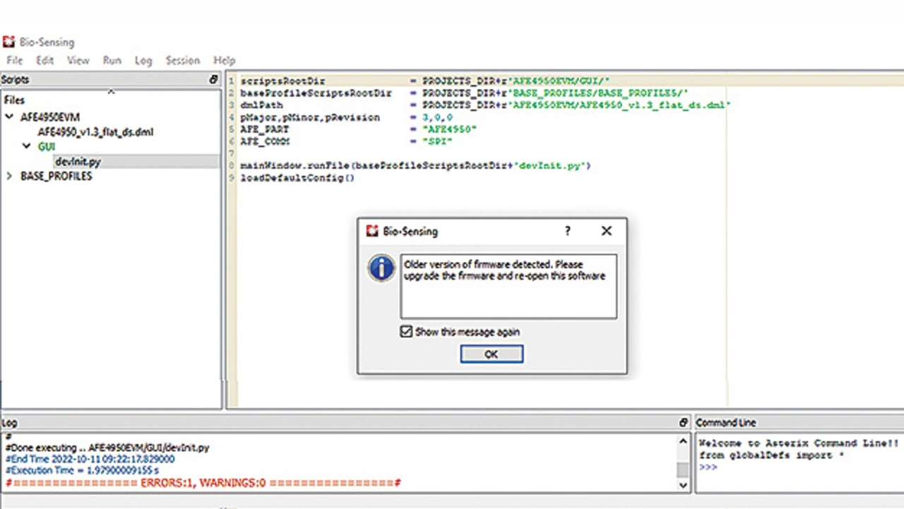 Es ist das kompakteste Evaluation Kit im Test, das AFE4950EVM von Texas Instruments, und mit einem eigenem Mikrocontroller für die Steuerung und Kommunikation ausgestattet. Zu ihm gehört ein Softwarepaket aus mehreren Python-Programmen, die leider nur unvollständig dokumentiert sind.