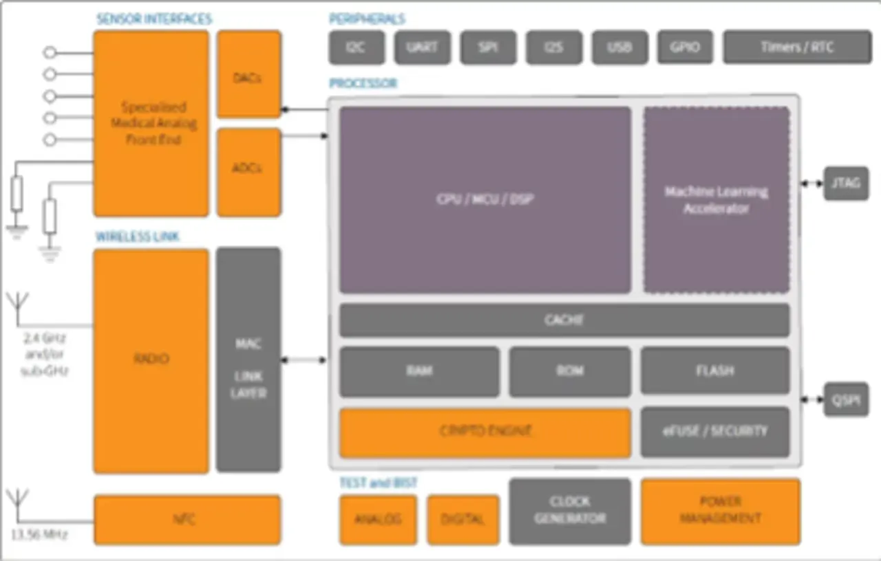 Eine kostengünstigere Methode für dasselbe Design ist ein Analog-Frontend-ASIC, der für gängige BLE-fähige Prozessoren ausgelegt ist. Die Flexibilität, verschiedene externe Prozessoren zu unterstützen, würde Änderungen in der Fertigung ermöglichen, sobald die Bedingungen in der Lieferkette dies erfordern.