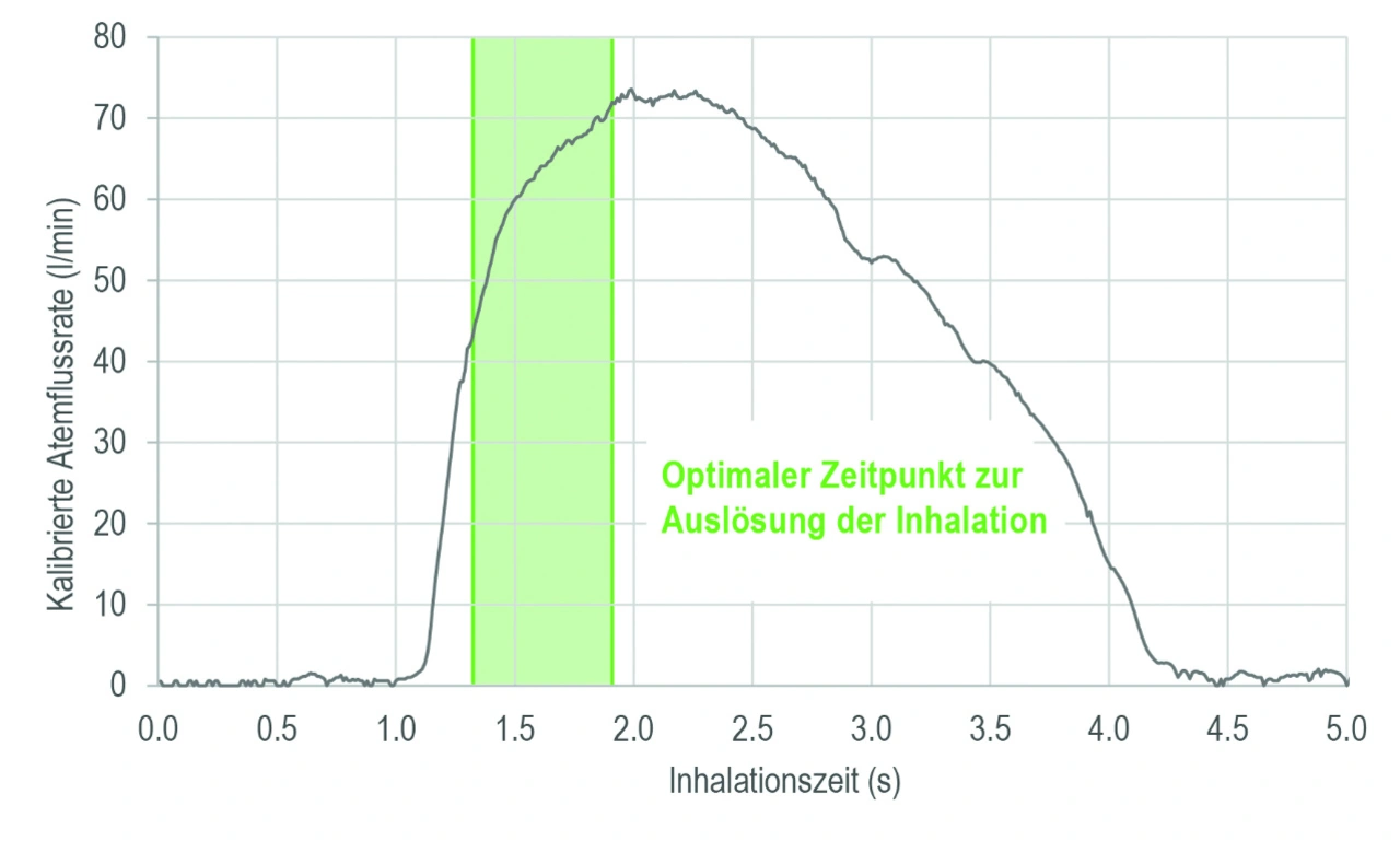 Mit einer zeitaufgelösten Messung des Inhalationsflussprofils lässt sich feststellen, ob der Inhalator zum optimalen Zeitpunkt ausgelöst wurde oder nicht (Bild 1). Denn nur, wenn dies der Fall ist, kann der Wirkstoff auch tief in die Bronchien getragen werden und dort wirksam werden. Bei verzögerter Auslösung oder zu schwacher Inhalation bleibt dieser besonders wichtige Teil der Lunge unbehandelt.