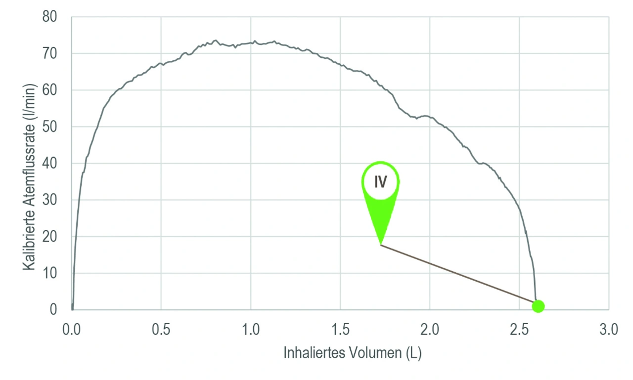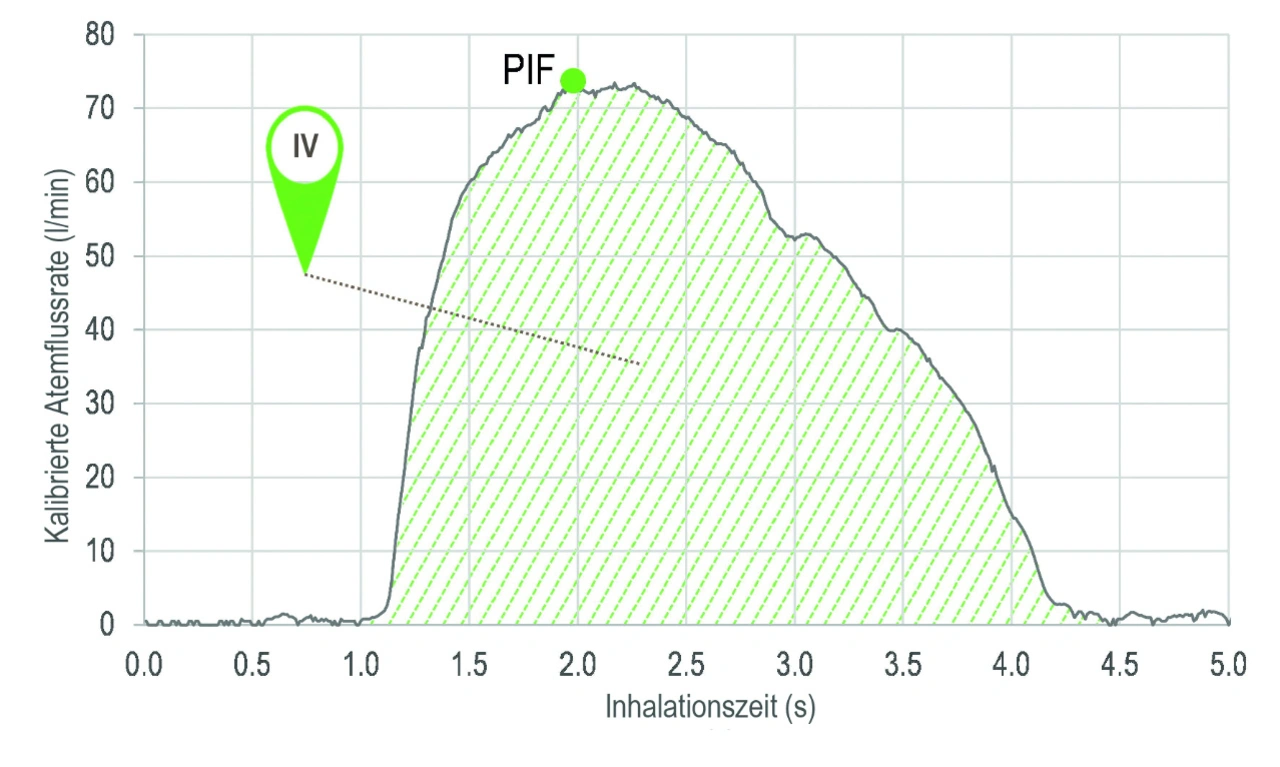 Mit präzisen und kalibrierten Echtzeitmessungen des Inhalationsprofils lässt sich bestimmen, ob ein Patient die Inhalation korrekt durchgeführt und eine entsprechend hohe Wirkstoffdeposition die gesamte Lunge erreicht hat. Weitere interessante Parameter, die sich aus gemessenen Inhalationsprofilen ableiten lassen, sind das inspiratorische Volumen (Inspired Volume, IV) und der inspiratorische Maximalfluss (Peak Inspiratory Flow, PIF). Diese Größen sind aus der Spirometrie entlehnt. Bild 2 zeigt beispielhaft ein gemessenes Inhalationsprofil und die daraus abgeleiteten Parameter.