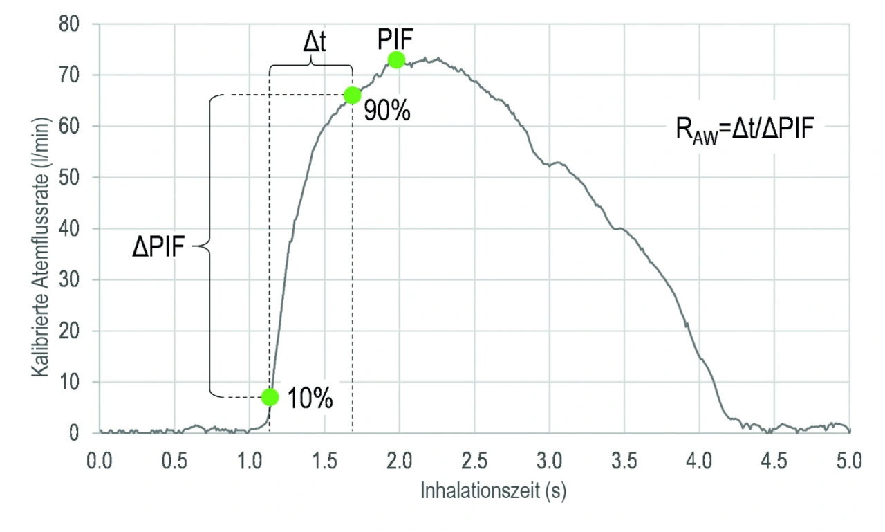 Auch Untergruppen von Parametern, wie das Inspirationsvolumen in der ersten Inhalationssekunde (IV1) oder der Atemwegswiderstand (Airway Resistance, RAW), lassen sich anhand des Atemflussprofils der Inhalation ermitteln. Die Bestimmung von letzterem ist in Bild 3 dargestellt.