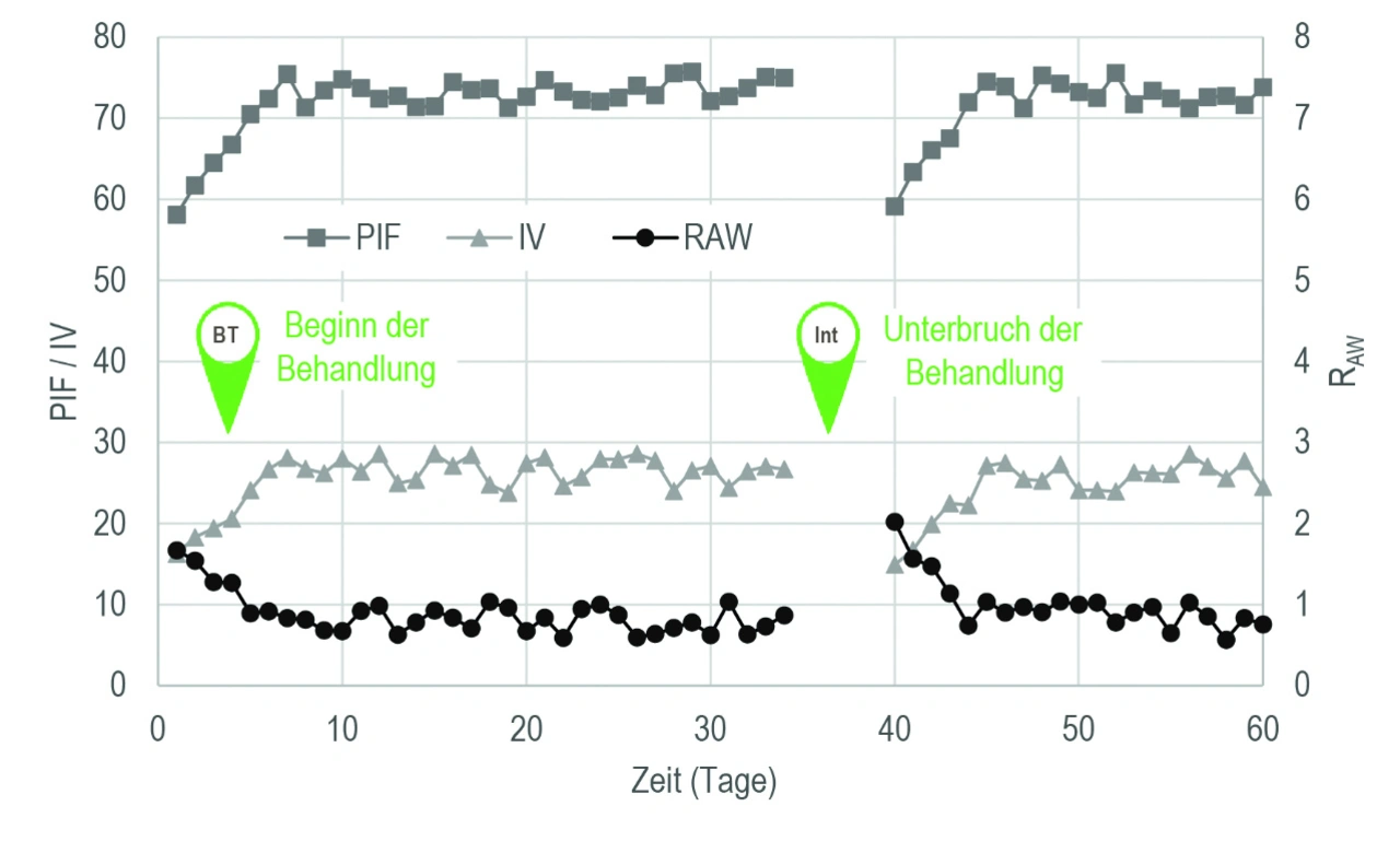 Bild 5 zeigt schematisch den möglichen Verlauf von PIF, IV und RAW während der Behandlung. Zu Beginn ist der positive Effekt der Medikation deutlich