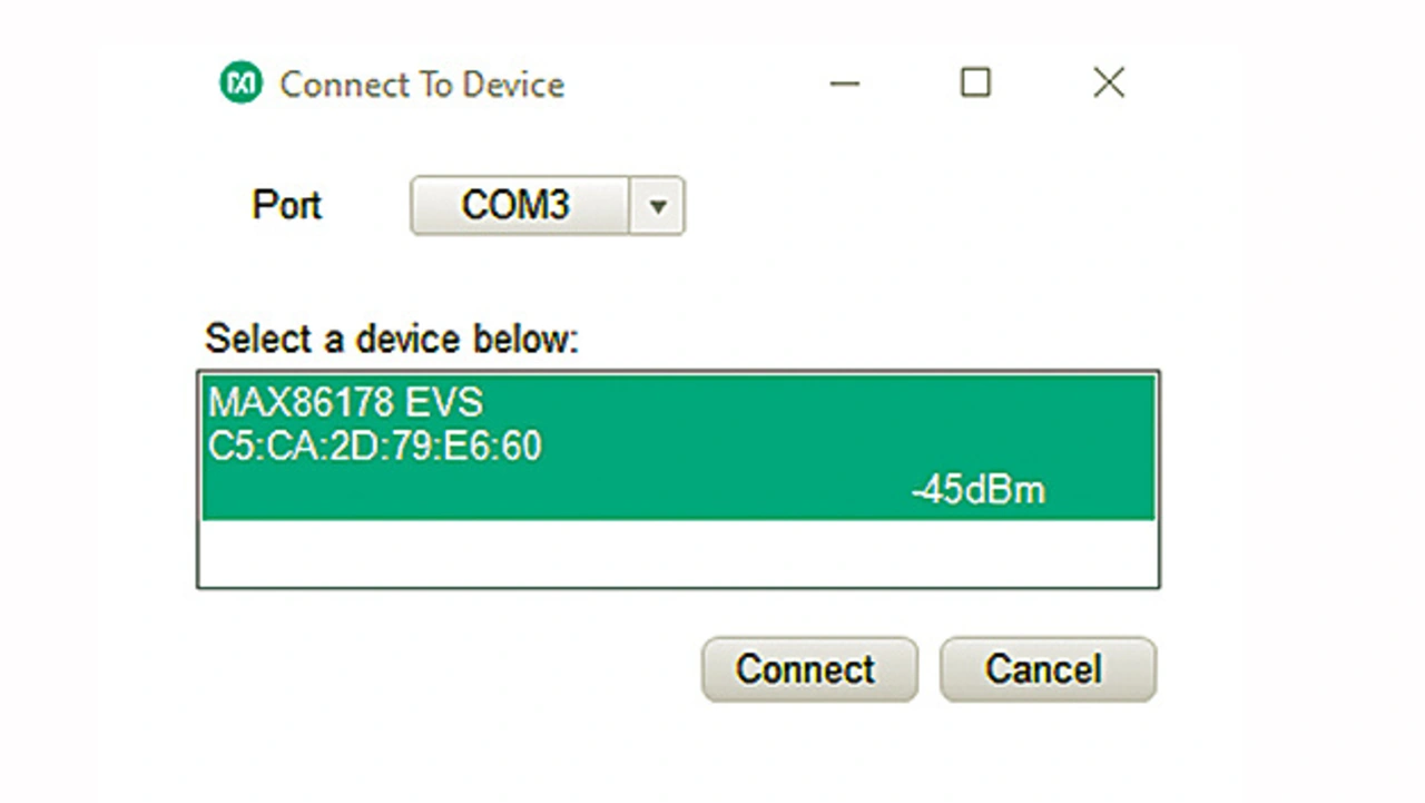 Nach dem Einschalten des Entwicklungskits blinken zwei kleine rote und eine grüne LED auf dem BLE-Funkmodul und nach dem Aufruf der Evaluation-Software erscheint zunächst ein »Verbindungsfenster« mit dem COM-Port des USB-Funkmoduls. Das Evaluation Board mit dem aufgesetzten BLE-Funkmodul muss sich daraufhin mit einer entsprechenden Anzeige (MAX86178SYS) in diesem Fenster melden, damit der Button CONNECT funktioniert und die eigentliche Software gestartet werden kann.