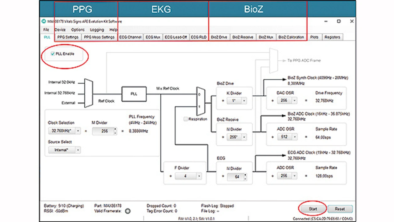 Nach dem CONNECT steht die Oberfläche (Bild 7) für die Konfigurierung und Ausführung der Messungen zur Verfügung. Da hat Maxim Integrated entsprechende Voreinstellungen getroffen, denn es sind eine Vielzahl von Optionen möglich, was mit den Taktfestlegungen unter PLL beginnt und eine ganze Reihe von Fragen aufwirft.