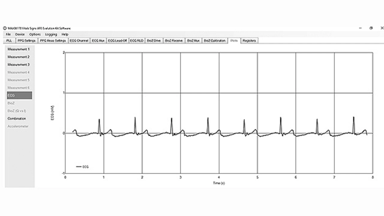 Die Plots-Seite (Bild 8) lässt sich für die Aufzeichnung mehrerer Kanäle, etwa für ein PPG- und ein EKG-Signal, konfigurieren. Für die EKG-Aufnahme sind die drei Elektrodenkabel mit dem Evaluation Board zu verbinden und passende Elektroden, die sich nicht im Lieferumfang befinden und über deren Qualität sich keinerlei Aussagen in der Maxim-Dokumentation finden lassen, auf die Druckknöpfe zu stecken. Genauso wenig gibt es Angaben, welches Kabel an welche Buchse gehört und wie die Elektroden am Körper zu positionieren sind.