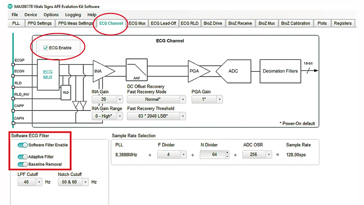 Wichtig für die Messung ist, dass auf der GUI-Seite ECG RLD die Option RLD Enable eingeschaltet wird, denn andernfalls ist das aufgenommene Signal derartig verrauscht und gestört, dass es unbrauchbar ist. Außerdem ist auf der Seite ECG Channel (Bild 10) die Option ECG Enable einzuschalten, sonst werden die EKG-Signale nicht auf die Verstärker durchgeschaltet. Standardmäßig – nach einem Reset – sind diese beiden Punkte deaktiviert. Auf der ECG-Channel-Seite lässt sich im Übrigen sehr schön erkennen, welche Einflüsse die Software-ECG-Filter auf die Messungen haben, wenn sie aus und wieder eingeschaltet werden.