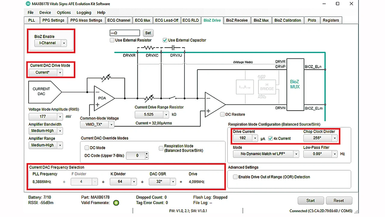 Zwei weitere Optionen sind auf der BioZ-Drive-Seite ausschlaggebend: Die DAC-Frequenzeinstellung für den auszugebenden Wechselstrom (Currend DAC Frequency Selection) sowie die Stromstärke (Drive Current). Diese Einstellungen wirken im Übrigen auch dann, wenn ein Testwiderstand (BioZ Calibration) für die Messung selektiert worden ist, sodass dann statt eines modulierten Elektrodensignals eine Gerade unter Plots dargestellt wird.