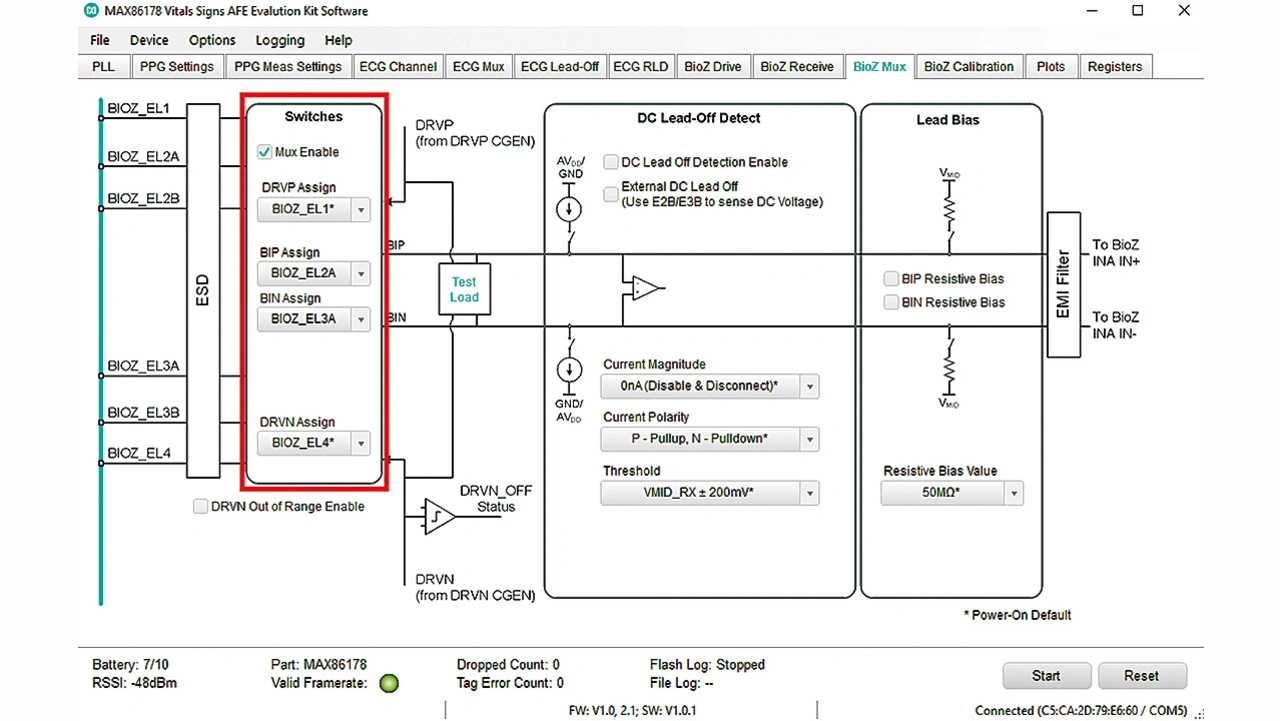 Die BioZ-Mux-Seite (Bild 12) verlangt auf jeden Fall eine wichtige Festlegung, und zwar die Angabe der Elektrodenzuordnung (DRVP, DRVN, BIN, BIP). Wenn diese nicht stimmt, was interessanterweise der Default-Einstellung entspricht, sind keine Messungen durchführbar.