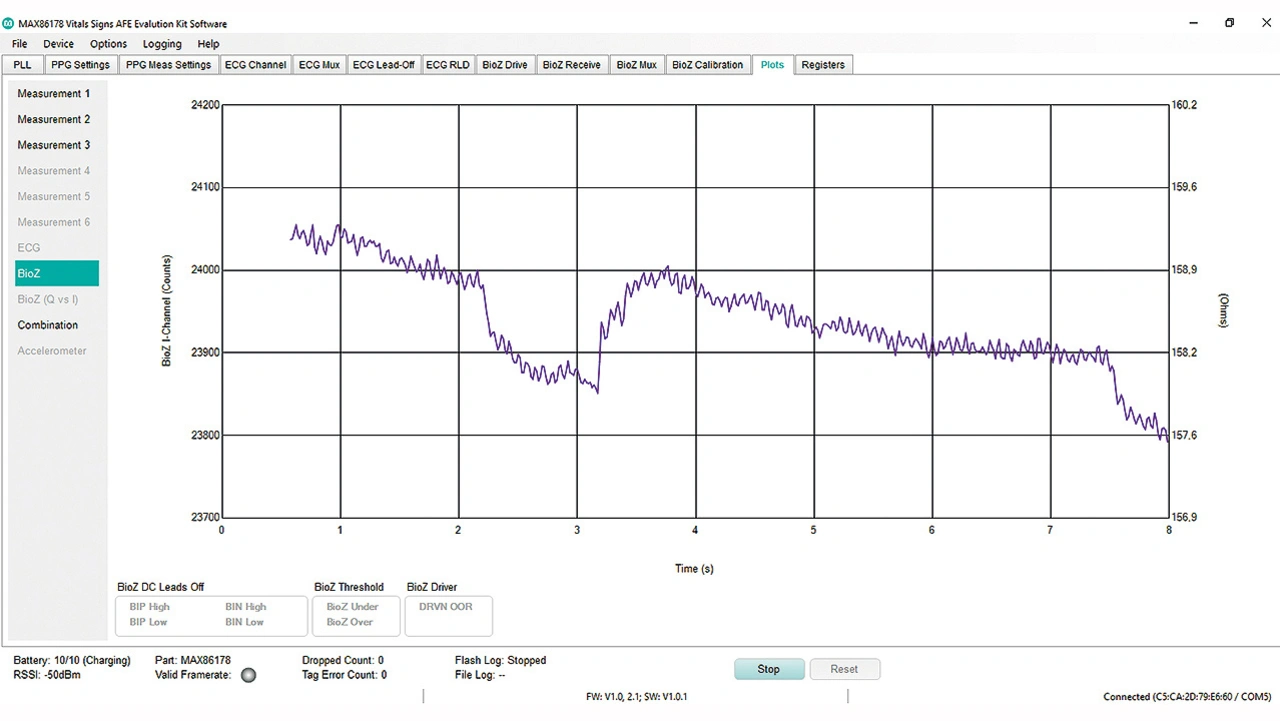 Bei entsprechender Einstellung ergeben sich mit korrekt angeschlossenen und konfigurierten Elektroden – es wurde der gleiche Elektrodentyp wie bei der EKG-Messung verwendet – unter Plots (Bild 13) zwar reproduzierbare Messkurven im dreistelligen Ω-Bereich für I und Q, die sich allerdings nicht mit den typischen BIA-Werten in Einklang bringen lassen, weshalb sich daraus weder ein vernünftiger Phasenwinkel noch sinnvolle Körperdaten berechnen lassen. Außerdem sind die als Standard geltenden Parametereinstellungen (Frequenzen, Strom) nicht einstellbar, was Zweifel an der Aussagekraft dieser BioZ-Messung aufkommen lässt.