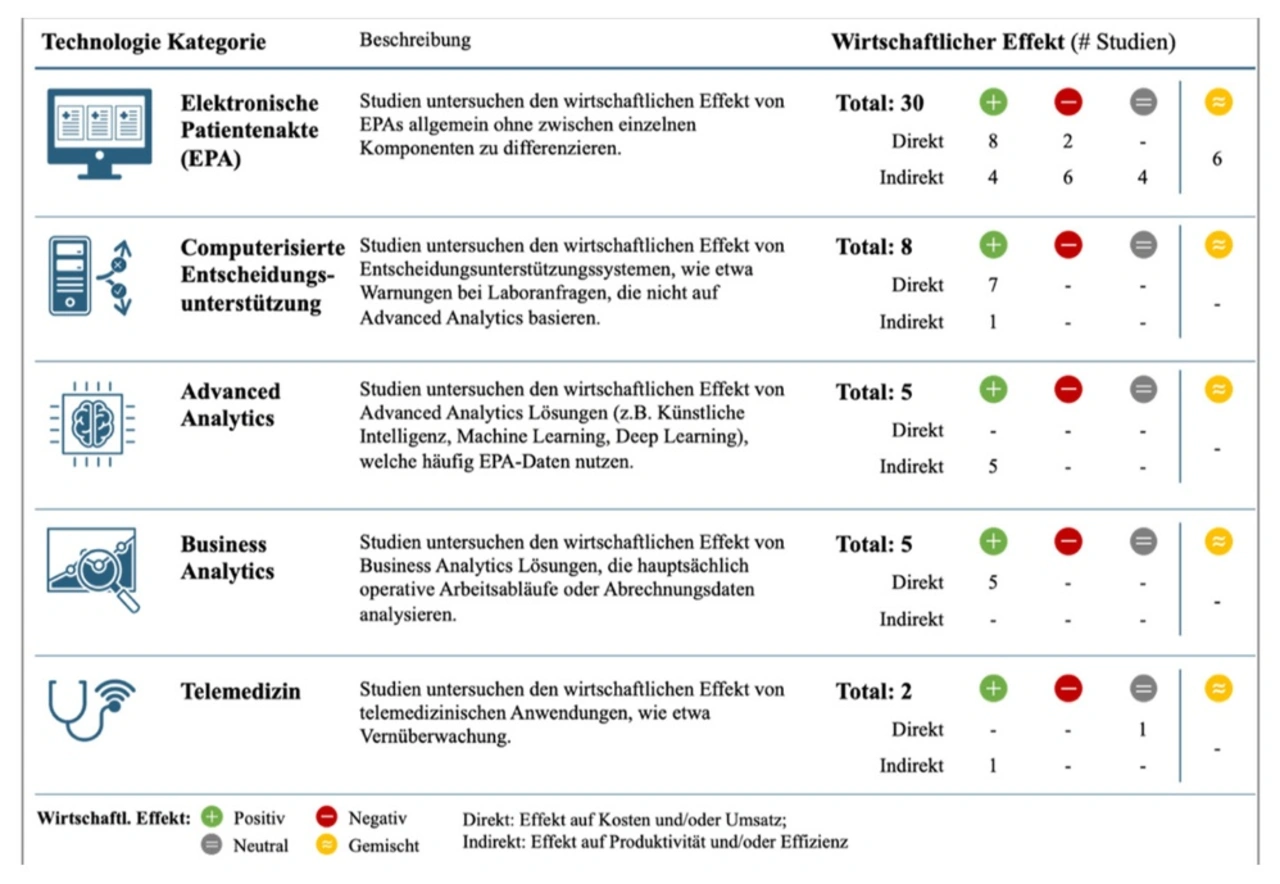 Der wirtschaftliche Einfluss von Data & Analytics auf Gesundheitsversorger ist abhängig von der jeweiligen Kategorie, jedoch zeigen grob 60 Prozent der berücksichtigten Studien, dass die Technologien insgesamt positive Effekte haben.