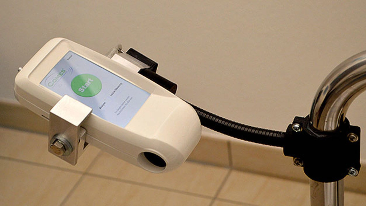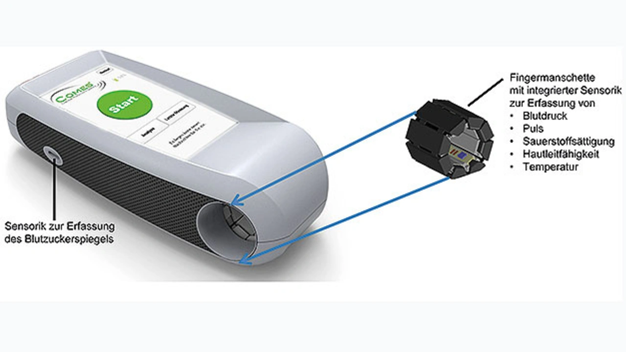 Eine Neuentwicklung ist die intelligente Toilette der Laborwohnung (Bild 1): Sie misst automatisch die Vitalwerte des Nutzers. Das Steinbeis-Transferzentrum Medizinische Elektronik und Lab on Chip-Systeme in München hat das kluge Örtchen und einen neuartigen Sensor für Urin konzipiert. Nach dem Toilettengang misst dieser diagnostisch relevante physikalische und chemische Werte des Urins und übermittelt die Daten an ein Gerät im Handlauf der Toilette. Das All-in-one-Medizingerät (Bild 2) misst dazu weitere Vitalwerte wie Körpertemperatur, Puls, Blutdruck, Hydratisierung und Sauerstoffsättigung.