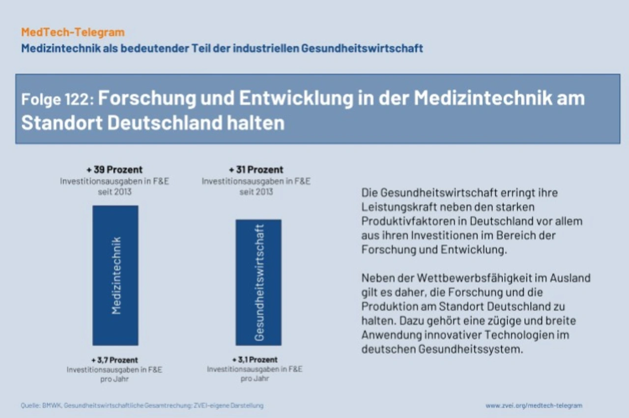 Die Erfolge auf den internationalen Märkten stehen insbesondere in der medizintechnischen Industrie in Zusammenhang mit den F&E-Aktivitäten. Neben der Wettbewerbsfähigkeit im Ausland gilt es aber auch, die Forschung und die Produktion am Standort Deutschland zu halten. Dazu gehört eine zügige und breite Anwendung innovativer Technologien im deutschen Gesundheitssystem. Wichtige Hemmnisse liegen hier in den komplexen Vergütungssystemen der Versorgungsbereiche und der Beherrschung der GKV-Regelungen. (Quelle: ZVEI)