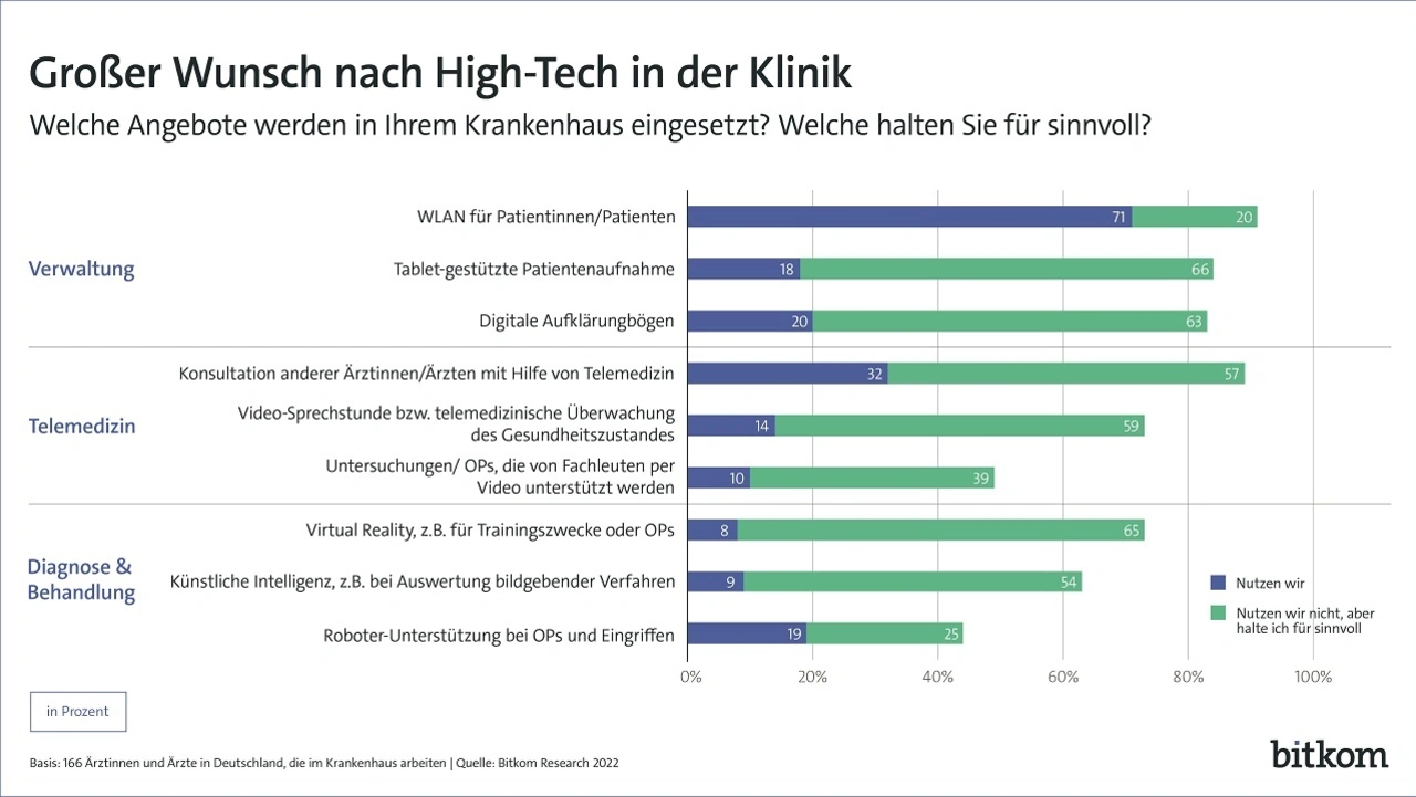 In Krankenhäusern und Arztpraxen werden bereits vielfach digitale Anwendungen genutzt oder angeboten, nicht nur in der Verwaltung, sondern ebenso bei Diagnose und Behandlung sowie bei Konsilen mit anderen Medizinerinnen und Medizinern. Unter den Klinik-Ärztinnen und -Ärzten geben bereits 71 Prozent an, dass ihr Krankenhaus WLAN für Patientinnen und Patienten bereitstellt. Bei weiteren 20 Prozent ist dies zwar nicht der Fall, die Befragten halten es aber für sinnvoll.