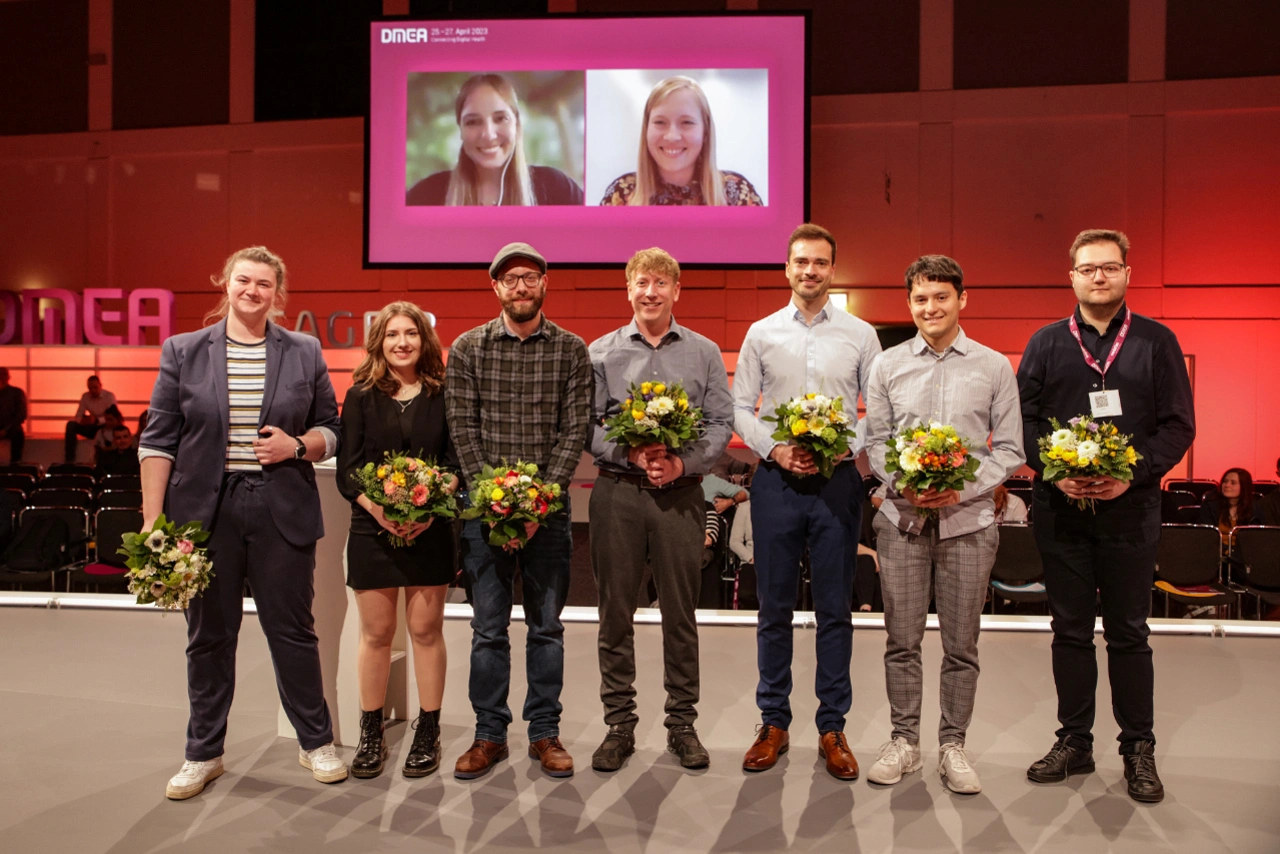 Für Start-Ups gab es in Halle 5.2 eine riesige Sonderfläche, mit dem Format "Start me up" konnte ein kuratierte Auswahl junger Unternehmer hre Geschäftsmodelle, Produkte und Services live präsentieren und so um potenzielle Partner, Investoren sowie Kunden pitchen. Die wichtigen Themen Karriere, Nachwuchs und Nachhaltigkeit sind im Nachwuchsformat DMEA sparks noch mehr in den Vordergrund gerückt worden. Studierende, Absolvent:innen und Young Professionals haben Kontakte in etablierte Unternehmen und zu Hochschulen und Klinik-IT-Abteilungen geknüpft – Arbeitgeber potenzielle neue Mitarbeiter:innen kennengelernt. Der DMEA-Nachwuchspreis (Bild) ging an Master und Bachelor-Studierende zum Thema IT-Architektur und Schluck-Analyse.