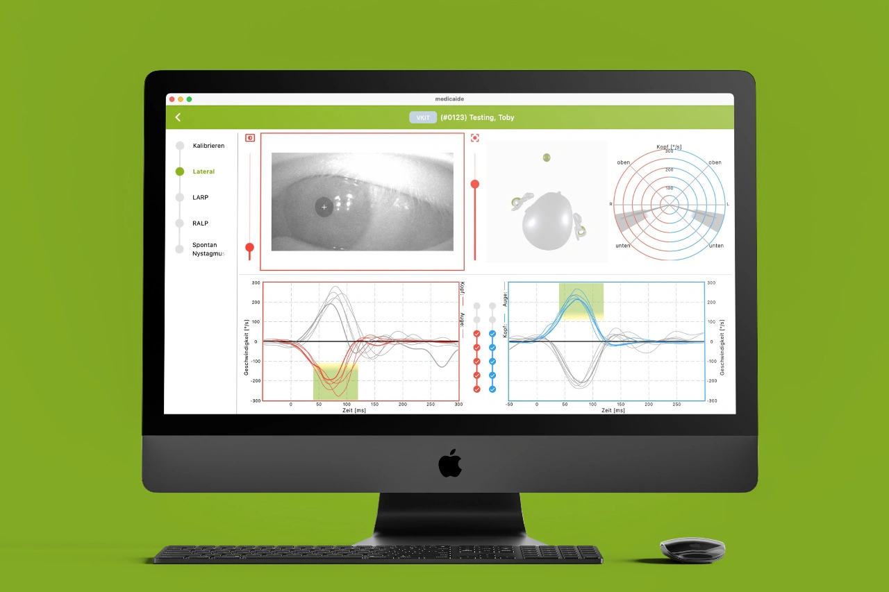 Video-Okulografie-Systeme werden von Ärzten, Kliniken und Forschenden eingesetzt, um dieses Zusammenspiel von Kopfbewegung und Augenreaktion zu messen. Ein klassisches Verfahren ist dabei der Video-Kopf-Impulstest, bei dem der Arzt den Kopf des Patienten fixiert und dreht. Kameras zeichnen dabei die Augenbewegung auf. Die Schnelligkeit der Augenreaktion und Sprünge in der Nachstellbewegung – die sogenannten Sakkaden – geben Aufschluss über mögliche Beeinträchtigungen und betroffenen Bogengänge.