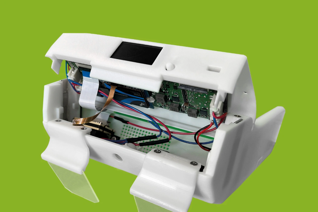 Für die kompakte, leichte und energieeffiziente Bauweise der Brille war neben den Kameras auch das Embedded-Vision-System für die Erfassung und Verarbeitung der Bilddaten ausschlaggebend. Als Prozessorboard war das Raspberry Pi Compute Module 4 gesetzt, weil dessen Entwicklungsumgebung und die zur Verfügung stehenden Tools und Programme eine schnelle Implementierung der Anwendung ermöglichten.