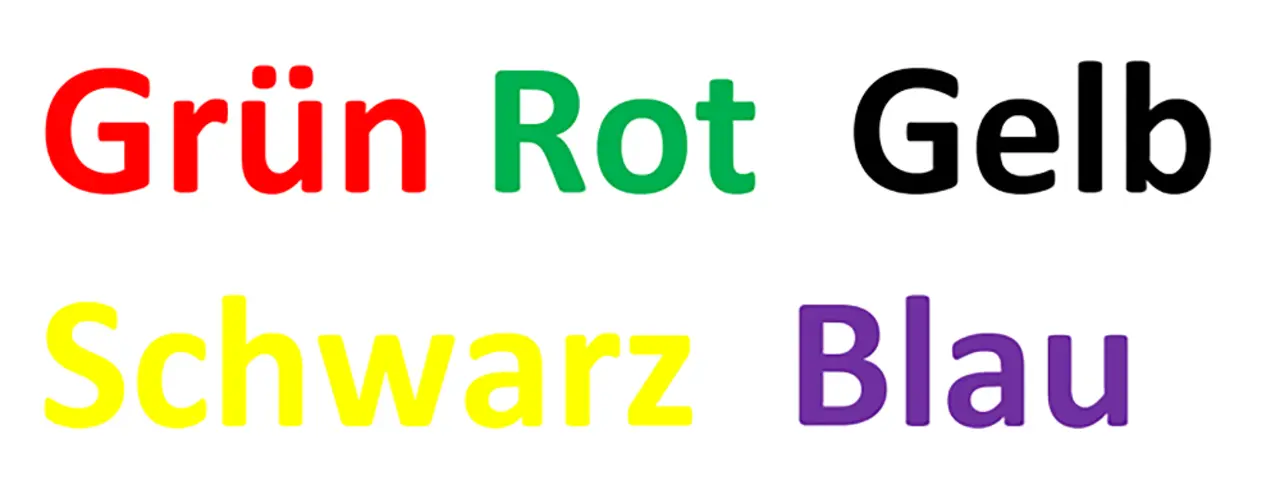 Insgesamt 246 Personen aus drei Altersgruppen nahmen teil: jung (19-33 Jahre), mittelalt (40-53 Jahre) und älter (65-88 Jahre). Die Teilnehmerinnen und Teilnehmer mussten drei Aufgaben mit steigendem Schwierigkeitsgrad bearbeiten. Es handelte sich um den sogenannten Stroop-Test: Dabei werden Farbworte in gleichen oder anderen Farben präsentiert – beispielsweise erscheint das Wort »grün« in roter Farbe (s. Foto).