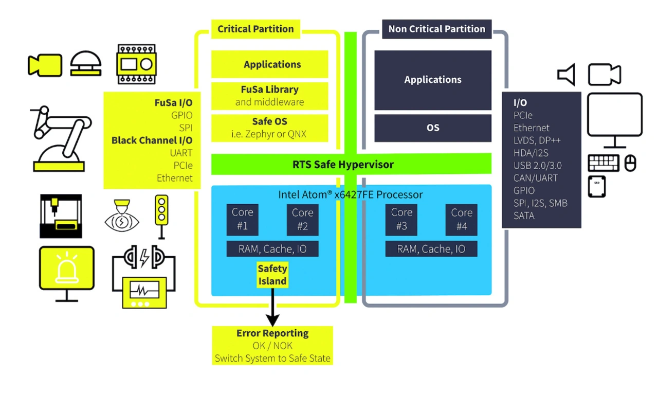 und wird weltweit verfügbar sein. Er wird als komplettes OEM-Paket geliefert, das den zertifizierten Echtzeit-Hypervisor mit funktional sicheren und nicht sicheren virtuellen Maschinen und einem zertifizierten sicheren Betriebssystem wie dem Linux-basierten Zephyr oder QNX bündelt. Dieses Paket richtet sich an jede handelsübliche oder kundenspezifische Embedded-Computing-Plattform, die mit Functional-Safety-fähigen x86-Prozessoren ausgestattet ist. Die ersten Implementierungen werden auf Intel-Atom-Prozessoren der Serie x6000E mit integriertem Intel-Safety-Island basieren (Bild 1). Eine Ausweitung auf Produkte basierend auf Intel-Core-Prozessoren der 11. Generation ist eine weitere Option für die Zukunft.