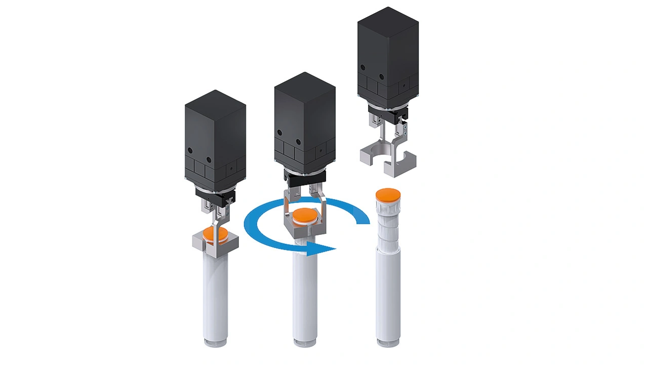 Ein Greifer der Serie GEP2000 kann für diese Anwendung mit einem Drehmodul kombiniert werden. Die Kombination aus Dreh- und Greifmodul wird zum Öffnen und Schließen von Probenröhrchen, zum Etikettieren von Vials und zum Aufbringen von Barcodes auf Probenröhrchen zum Scannen eingesetzt. Durch die individuelle Einstellbarkeit der Kräfte und Positionen von Greifer und Drehmodul können unterschiedlich große Behälter schnell und präzise gehandhabt werden. Dadurch wird eine hohe Prozessgeschwindigkeit und Flexibilität ermöglicht.