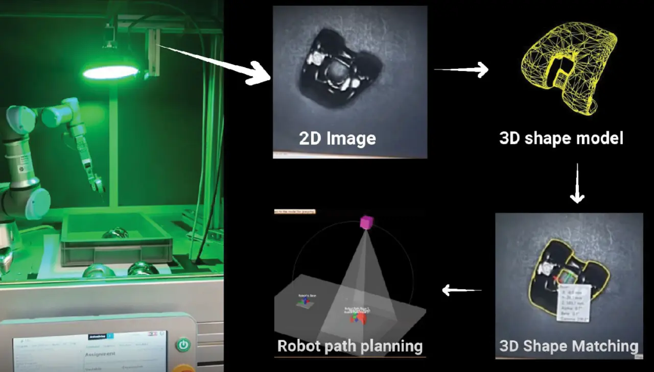 Im Zentrum der Pick-and-Place-Anwendung steht ein 6-achsiger UR3-Roboter, ausgestattet mit einem Greifer (End-of-Arm-Tool). Für eine bessere Leistung und zur gleichmäßigen Umgebungsbeleuchtung wurde in der Roboterzelle ein Ringlicht installiert. Als Bildeinzug dient eine 2D-Industriekamera. Per Laptop und Halcon-Software gesteuert, macht die 2D-Bildkamera eine Lokalisierung des Objekts möglich. Die Koordinaten der lokalisierten Teile werden über TCP/IP an die Robotersteuerung gesendet.