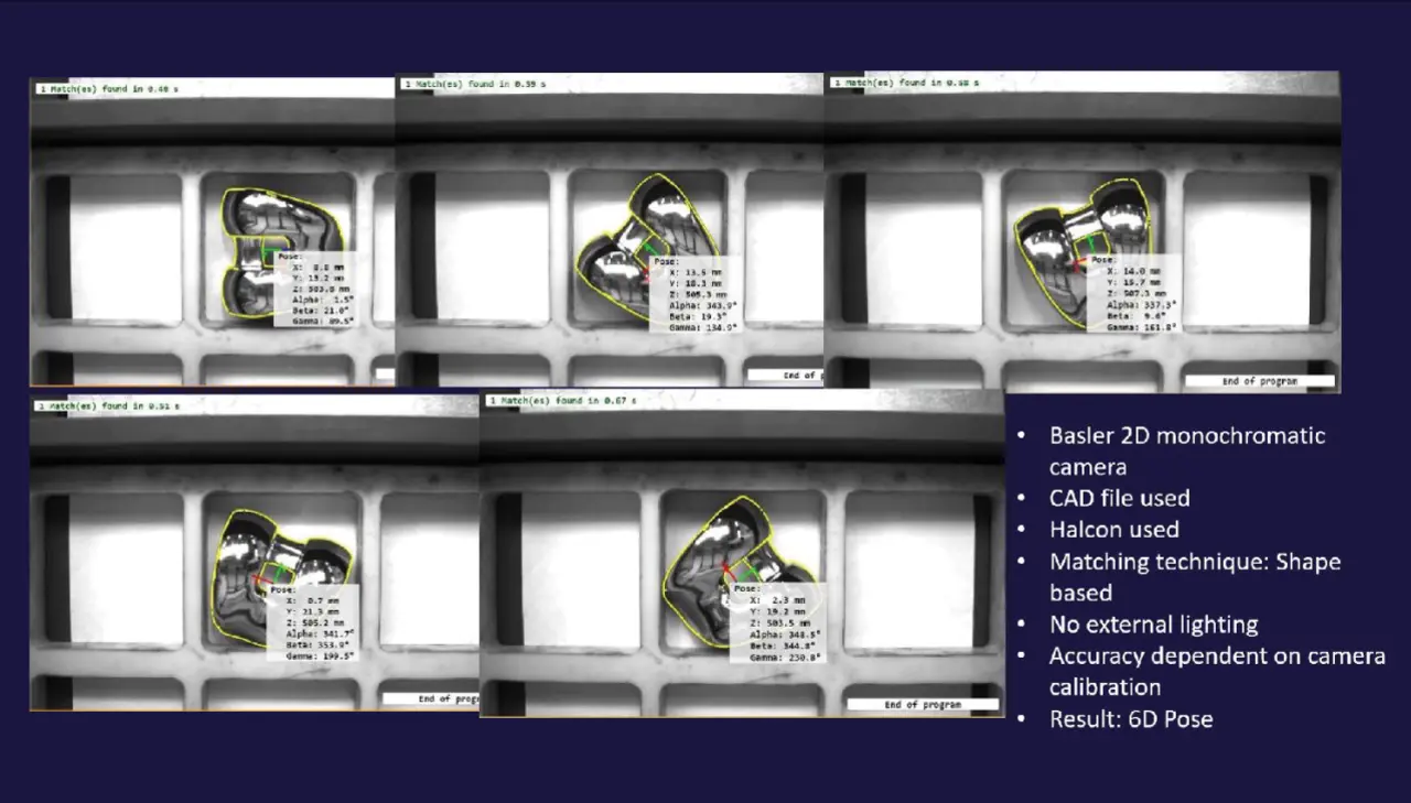 Bei der Entnahme des Bauteils während der Fertigung liefert eine 2D-Kamera das Profil, welches mit den gespeicherten 3D-CAD-Profilen verglichen wird. Die Treffergenauigkeit wird als Punktzahl zwischen 0 und 1 generiert, um das optimale Teileprofil und Greifverhalten des Roboterarms zu bestimmen. Die genauen 3D-Koordinaten werden folgend an den Roboter gesendet.
