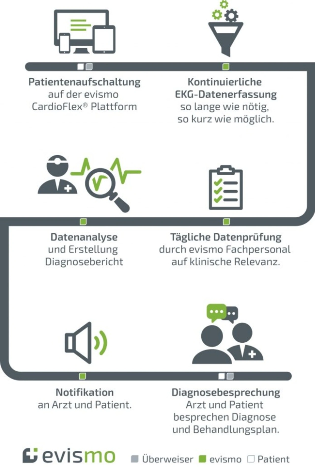 Der leichte, wasserdichte EKG-Sensor wird so kurz wie möglich, aber so lange wie nötig getragen. In der Regel liegt die Tragedauer bei einem bis dreißig Tagen [7]. Die tägliche Datenprüfung und EKG-Analyse läuft nur so lange, bis eine Diagnose gestellt werden kann. Das vermindert Mehrfachuntersuchungen und macht eine raschere Diagnose und Behandlung möglich. Dadurch wird die Patientenzufriedenheit gesteigert, der Aufwand für Ärzte und medizinisches Personal minimiert sowie die Diagnosekosten gesenkt. Der Patient wird informiert, sobald der Sensor entfernt werden kann. Die Analyse der Daten und die Diagnosestellung erfolgen abschließend durch den überweisenden Kardiologen oder durch einen Kardiologen aus dem Servicecenter von Evismo.