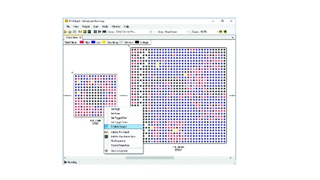 Während Boundary-Scan-Testsoftware wie XJTAGs XJRunner eine Lösung für derartige automatisierte Tests bietet, verwenden zugehörige Tools wie XJAnalyser Boundary-Scan-Techniken, um ein leistungsfähiges Debugging-Tool bereitzustellen. Diese Software bietet dem Bediener eine interaktive grafische Darstellung aller JTAG-Komponenten auf der Platine (Bild 3). Durch einfaches Klicken auf das Bild des Pins wird das physische Gegenstück auf Hoch, Niedrig, Kippen oder Impedanz eingestellt. Dieselbe bildliche Echtzeitansicht wird verwendet, um den resultierenden Status der Pins aller JTAG-fähigen Komponenten zu überwachen, wobei die Farbcodierung eine leicht nachvollziehbare Darstellung der gelesenen Ebenen darstellt.