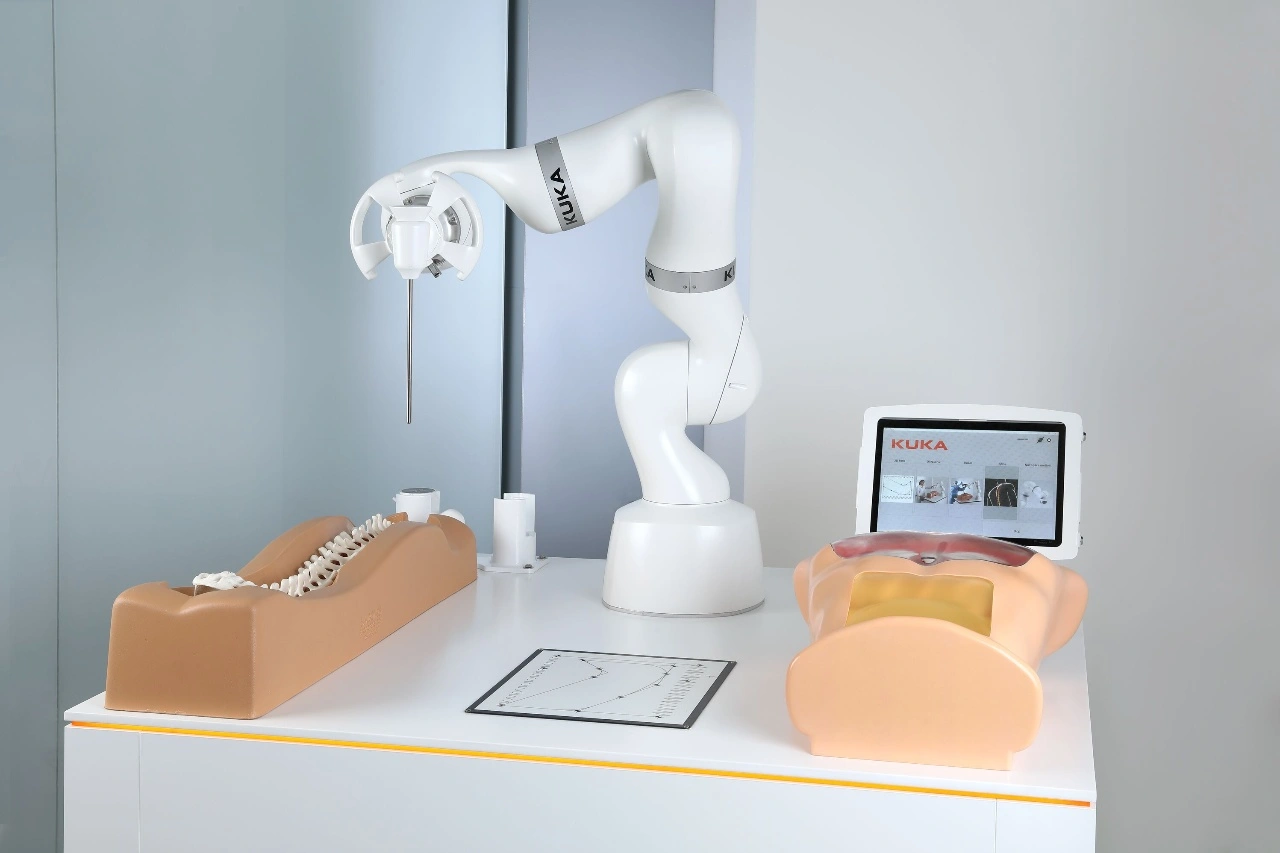 Schnelleres und präziseres Positionieren bei perkutanen Eingriffen, also dem Setzen von Nadeln unter der Haut, vereinfacht den Alltag von Ärzten. Das neue robotergestützte Assistenzsystem Guidoo des langjährigen Kuka Partners BEC GmbH erlaubt bei solchen Anwendungen eine rund fünfzigprozentige Zeitersparnis. Gleichzeitig kann mit dem Assistenzsystem äußerst genau gearbeitet werden, sodass nur noch minimale Kollateralschäden am umliegenden Gewebe entstehen.