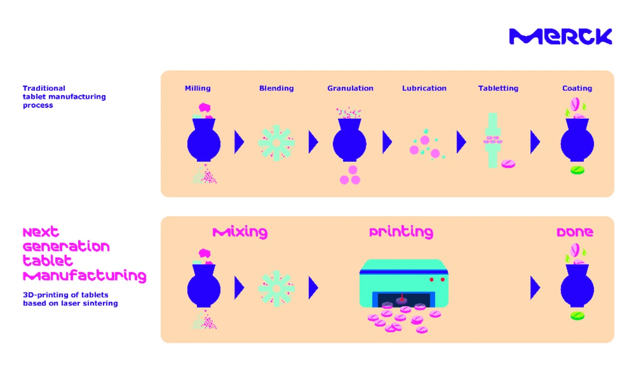 Die Tablettenproduktion der nächsten Generation mithilfe von 3D-Druckverfahren ist ein Projekt des Innovation Center von Merck am Konzernsitz in Darmstadt. Dort arbeiten Projektteams an der Entwicklung und Skalierung von Ideen zur Erschließung neuer Geschäfte innerhalb und außerhalb der aktuellen Tätigkeitsgebiete seiner drei Unternehmensbereiche Healthcare, Life Science und Performance Materials. (me)