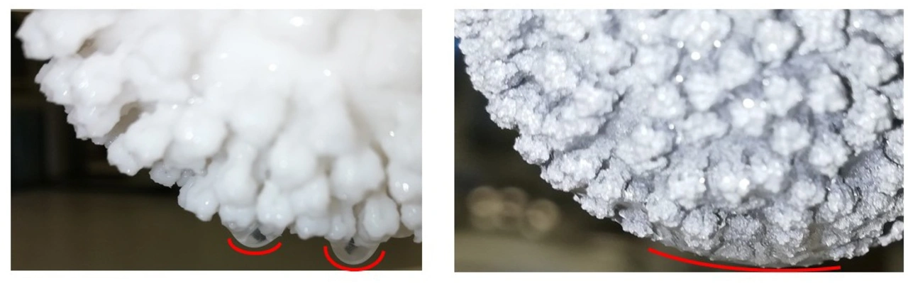 Im Vergleich zum Polymermodell (vgl. Bild 2) schneidet das Metallmodell aufgrund der geringeren Masse des Wassers durch die geringere Größe des Modells deutlich besser ab. Die Modelle wurden mit einem Adhäsionsspray hydrophilisiert. Beim Polymermodell verfälschen jedoch die entstehenden Wassertropfen das Ergebnis, beim Metallmodell ist hingegen korrekt benetzt.