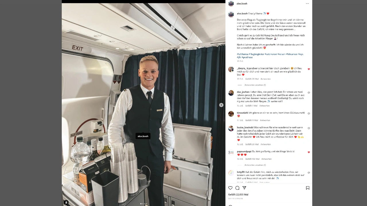 Auf der Langstrecke nach New York trat Alex Böhmer nach fast vier Jahren Zwangspause seinen »zweiten ersten Flug« als vollwertiges Kabinenmitglied an. Wie gewohnt, lies er seine Instagram-Follower an seinem ersten Tag teilhaben - die Freude, Erleichterung und Dankbarkeit stand ihm in jeder einzelnen Story ins Gesicht geschrieben. »Unglaublich, oder?«, schreibt er überwältigt während eines Spaziergangs mit Kollegen über die sonnige Brookly-Bridge. Der Mittzwanziger lebt seinen Traum – vollständig genesen darf er wieder in den Lüften unterwegs sein und Reisende über den Wolken betreuen. Dank modernster Medizintechnik und seinem ganz persönlichen Durchhaltevermögen ist er damit für andere Krebspatienten, Prothesentragede und Menschen in schwierigen Lebenssituationen ein Vorbild für Mut, Stärke und Zielstrebigkeit. Guten Flug!
